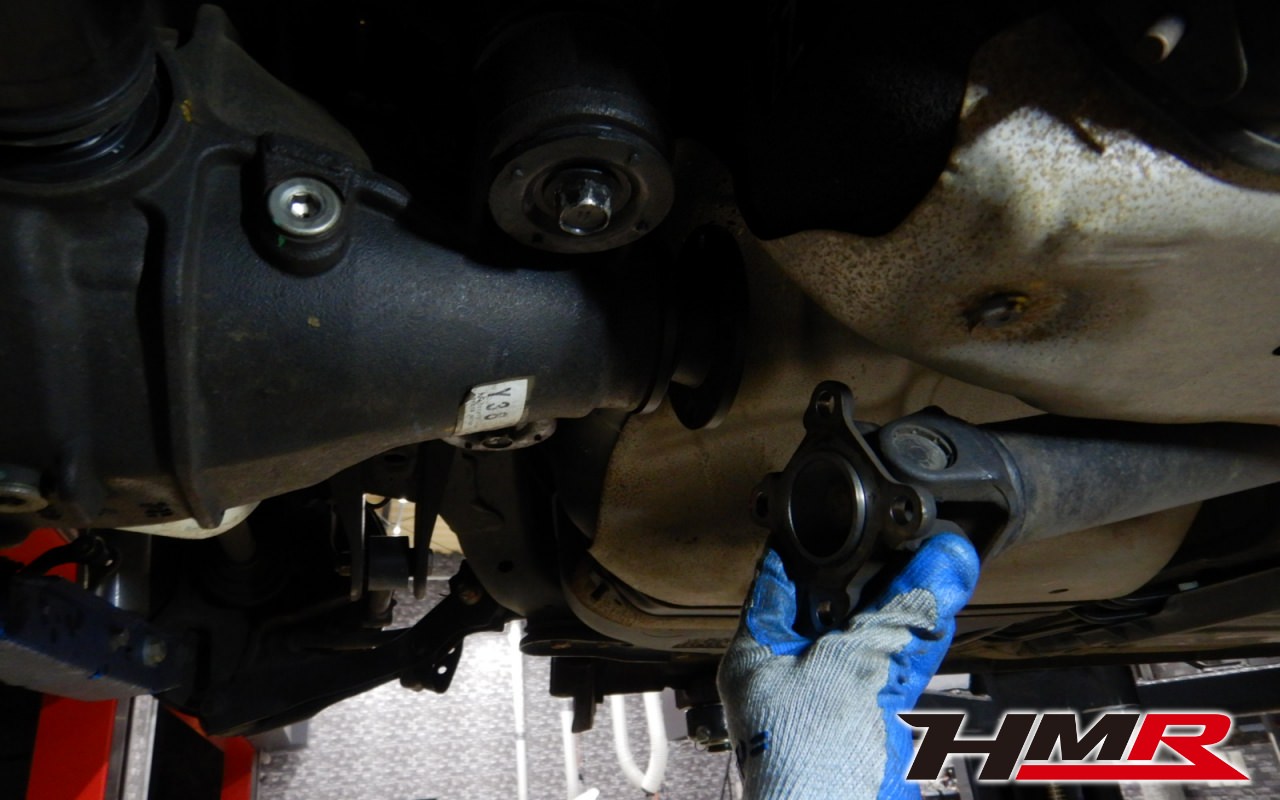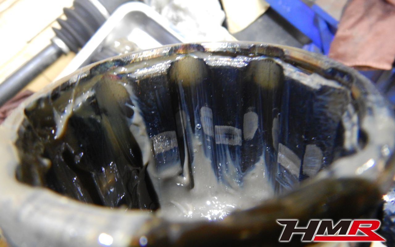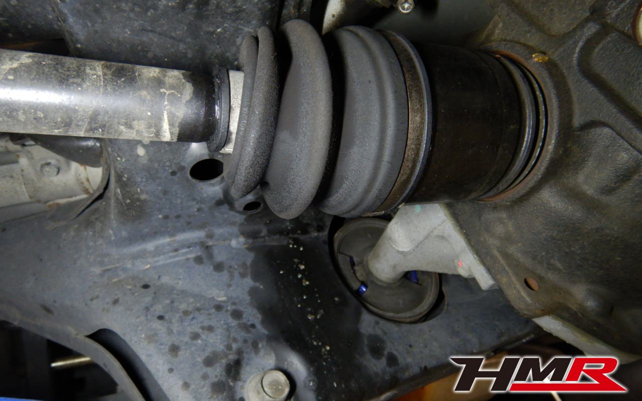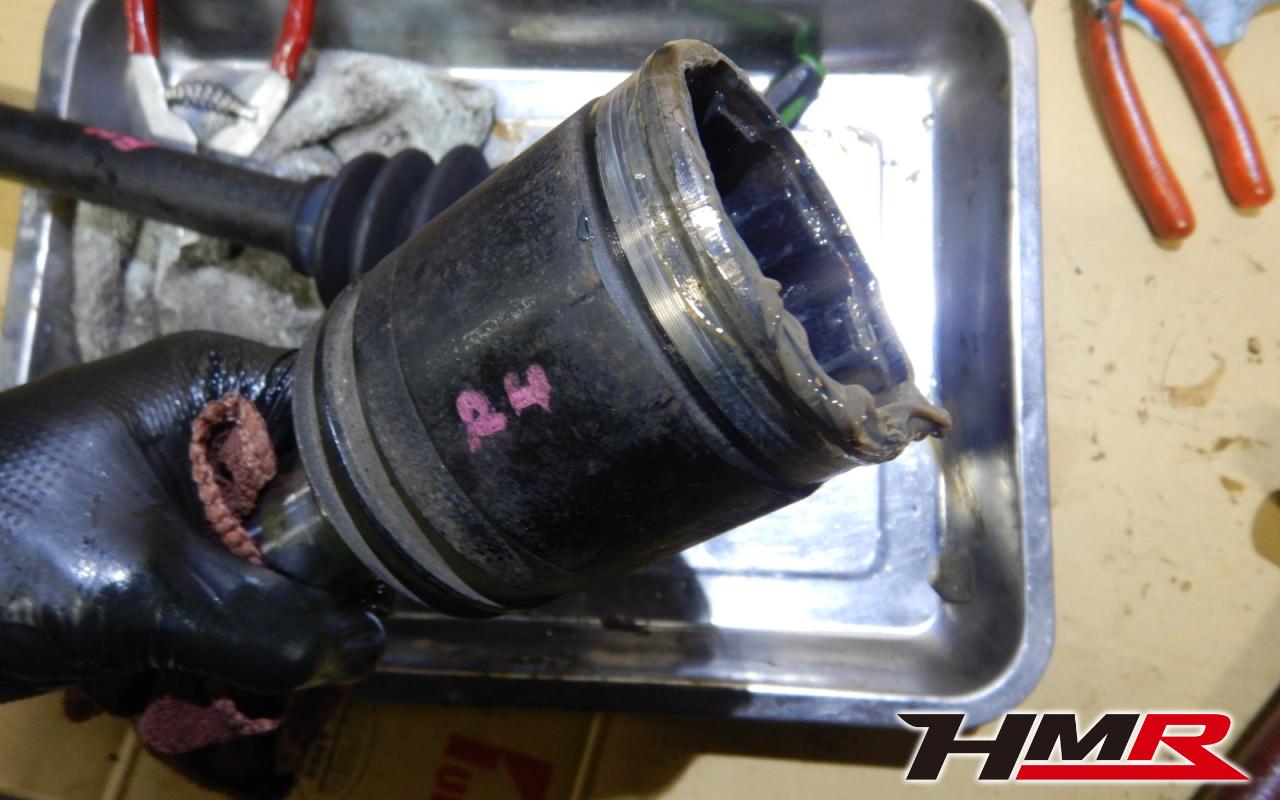 リフトアップをして各部をチェックをしつつドライブシャフトオーバーホール作業に入っていきます。ドライブシャフトに近づいていくと・・・ 右側のドライブシャフトですが、ブーツのすぐ後ろにあるデフマウントに何かがかなり飛び散ってテカテカしているのがわかりますね。 これはドライブシャフトブーツが切れてしまい、切れ目から内部に塗布されているグリスが外に飛び散ってしまっています。これを放置したまま走り続けていると、内部のグリスがなくなってスムーズな動作に支障が出ます。更に切れ目から水やゴミ・砂などといった異物が進入し、ドライブシャフト破損に繋がる恐れがあります。