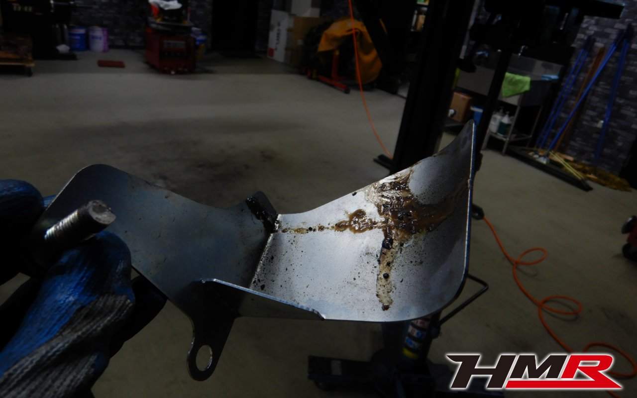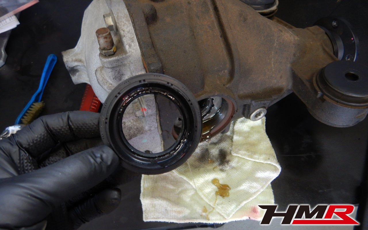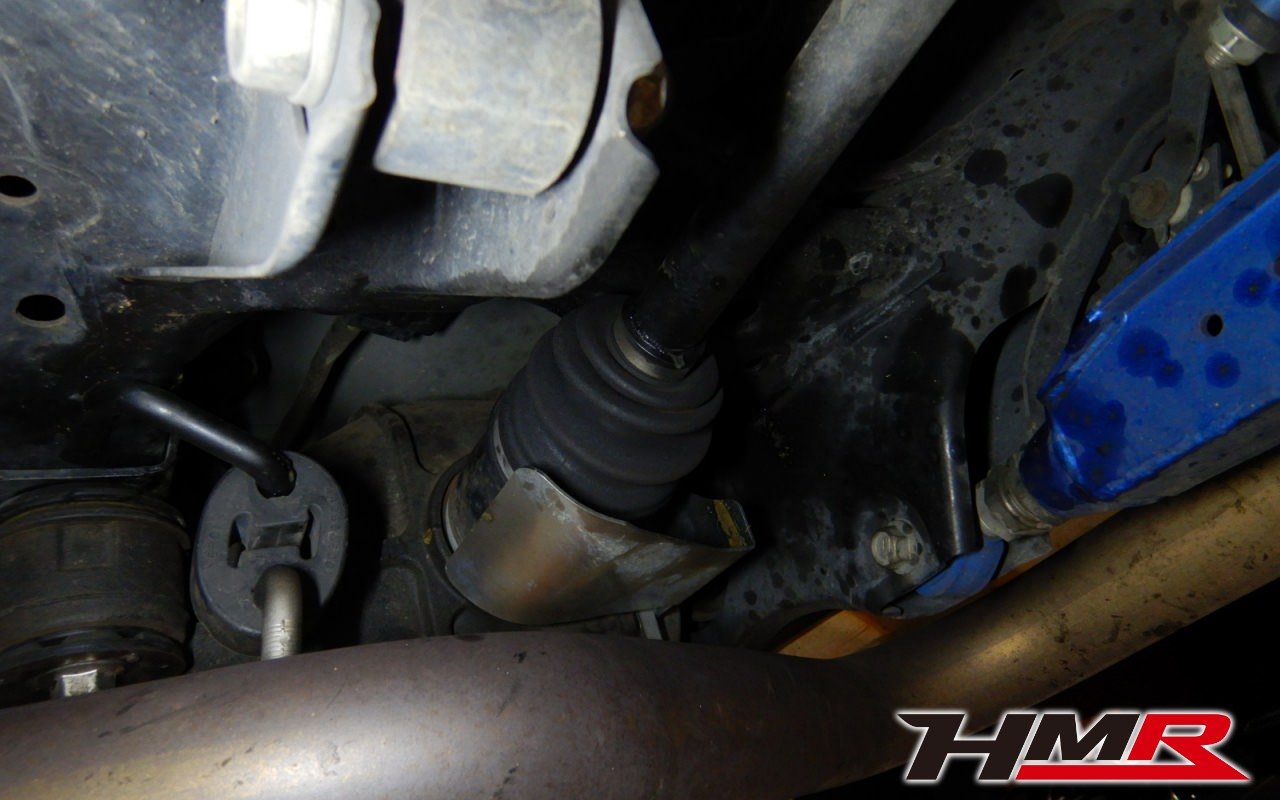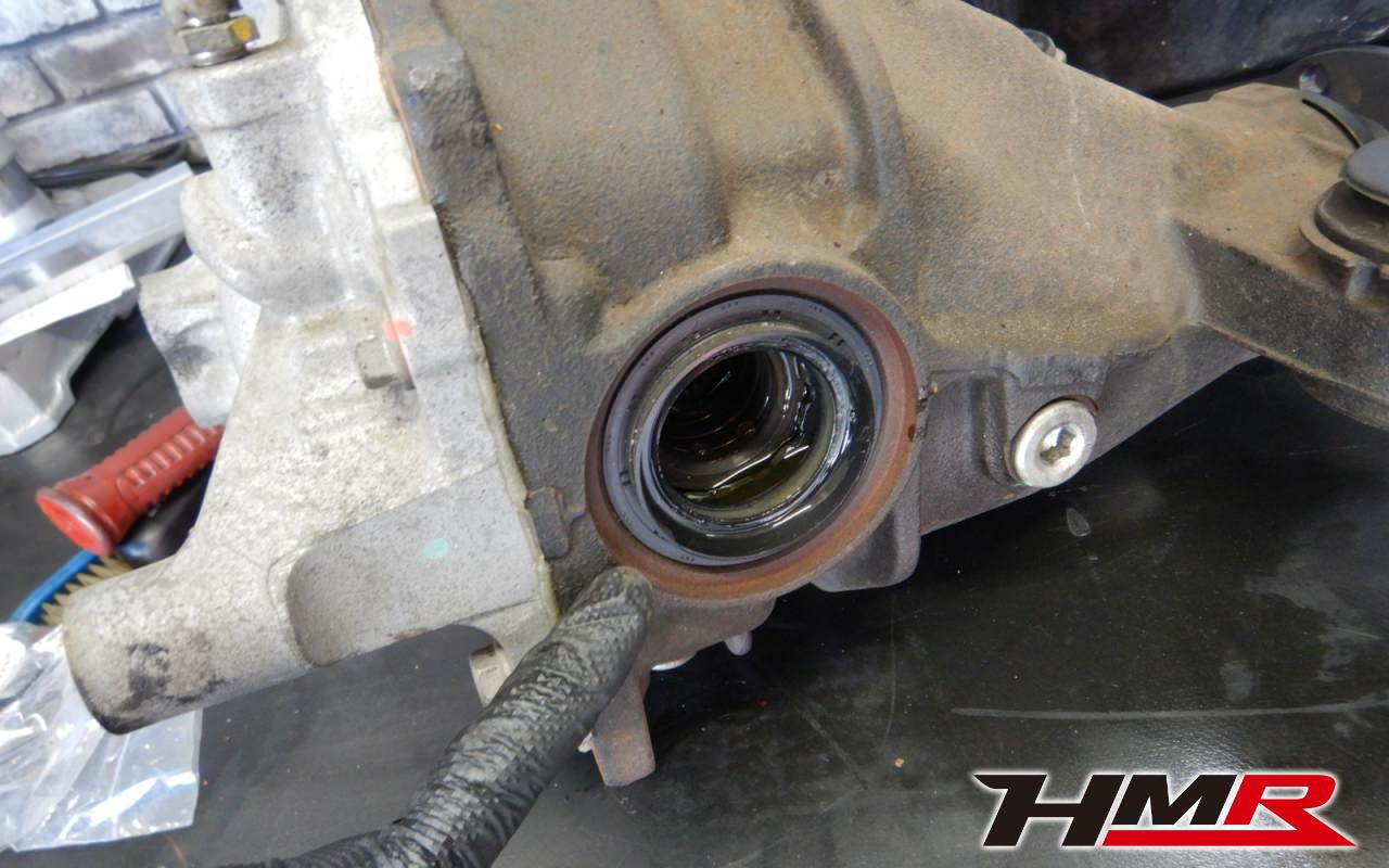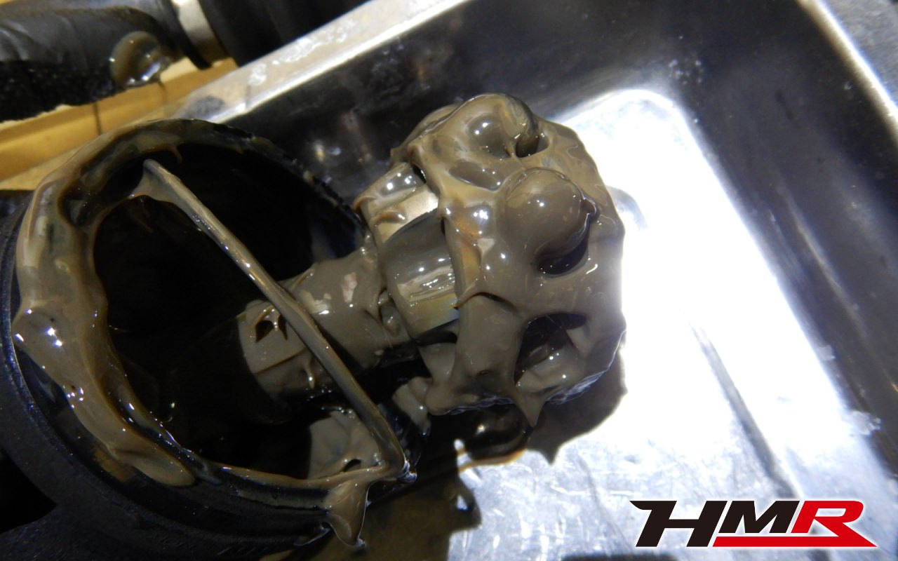 リフトアップをして各部をチェックをしつつドライブシャフトオーバーホール作業に入っていきます。ドライブシャフトに近づいていくと・・・ 右側のドライブシャフトですが、ブーツのすぐ後ろにあるデフマウントに何かがかなり飛び散ってテカテカしているのがわかりますね。 これはドライブシャフトブーツが切れてしまい、切れ目から内部に塗布されているグリスが外に飛び散ってしまっています。これを放置したまま走り続けていると、内部のグリスがなくなってスムーズな動作に支障が出ます。更に切れ目から水やゴミ・砂などといった異物が進入し、ドライブシャフト破損に繋がる恐れがあります。
