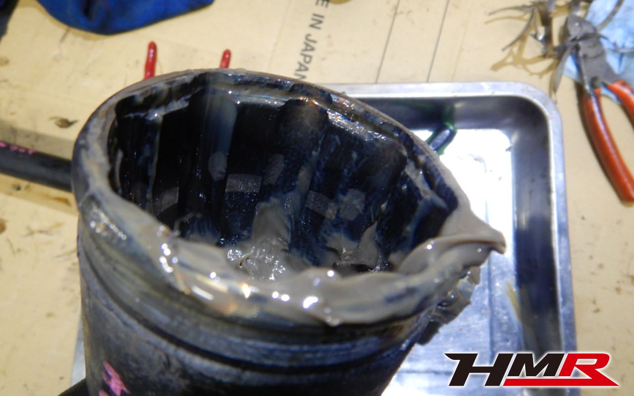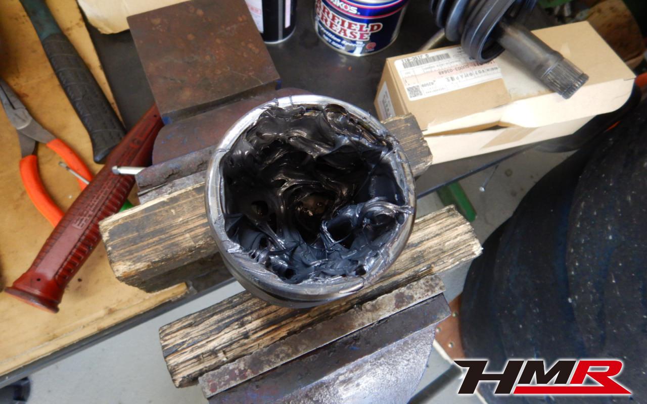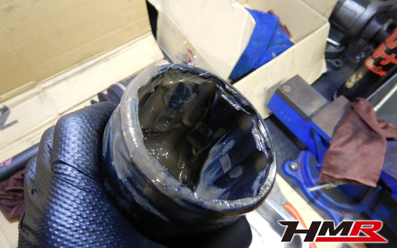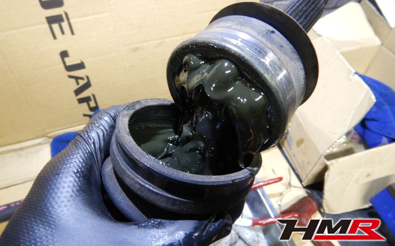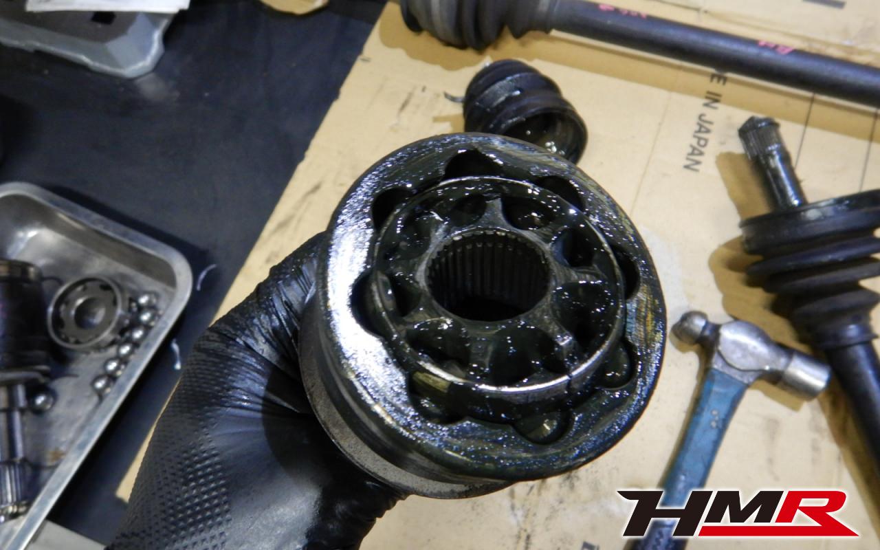 何よりもこのままでは保安基準に不適合なので車検を取得できません。更に近づいてみると飛び散りがよりはっきりわかります。 左側はより広範囲にグリスが飛び散っていますね。早速作業に取り掛かるので、プロペラシャフトをリアデフから取り外し、左右ドライブシャフトとリアデフも降ろしていきます。手に持っているのはドライブシャフトブーツの遮熱板です。86/BRZはマフラーセンターパイプが左ドライブシャフトブーツのすぐ真下を通ります。その為、サーキットなどで高負荷な走行を行うと高温の排気ガスで熱されたセンターパイプの熱でブーツも熱くなり、ブーツの破損・グリスの劣化を引き起こします。この遮熱板はそれらを防ぐだけではなく、今回の様にブーツが破れてしまってグリスがセンターパイプに付着し、火災といった二次トラブルを防止してくれます。ドライブシャフトを取り外しました。 アウタージョイント(ホイール側)のブーツをチェックします。指で触れている辺りは細かなヒビ割れが多数みられます。 インナージョイント(デフ側)ブーツを外して内部のハブベアリングなどをみていきます。  ドロドロしているのはグリスです。この内側にボールベアリングがついたジョイントがあり、ボールベアリングが溝の中を前後し、スムーズに回転を伝達しています。グリスが少なくなったり、水分や異物の進入でこの動きが阻害され、正常な走行ができなくなる恐れがあります。グリスでドロドロになっていますが、こちらがベアリングです。 取り外したら、分解洗浄していきます。 ジョイント内の打痕や傷をチェックします。打痕の部分が凹んでいたり、ひび割れが発生しているこのジョイントは使用できません。ジョイントごとやドライブシャフト自体の交換が必要になってしまいます。今回は大きな損傷は無かったのでオーバーホールを進めていきます。 次にタイヤ側のアウタージョイントを分解していきます。 こちらもインナージョイントと同様にグリスがたっぷり封入されています。 分解出来たらインナー側と同様打痕のチェックをします。  分解したら丁寧に古いグリスや汚れを落としていきます。 ピカピカになりましたね♪ 今回はWAKO’S製のグリスを使用します。サーキット走行向けのハードタイプのグリスをオリジナルMIXして使用します。 今回交換するドライブシャフトブーツのキットです。 ベアリングにたっぷりとグリスを塗って 新しいブーツを装着していきます。  「これでもか!」みたいな量のグリスですが、常に高速回転するベアリングを長期間を保護し動作させるにはこれだけ必要なのです。  ベアリングも元の形状があやふやになるぐらいたっぷりグリスを塗布します。 これでドライブシャフトオーバーホールは完了です。 取り付ける前に降ろしたリアデフのデフサイドオイルシールを交換していきます。こちらもオイル漏れが発生しやすい箇所です。安価なパーツなのでドライブシャフト作業の際は同時に交換しておきたいですね。  そして取り外しの逆の手順でリアデフ、ドライブシャフト、プロペラシャフト装着し、リアデフオイルを交換します。最後にミッションオイルも交換します。 これで作業完了となります。Y様、この度は作業のご依頼ありがとうございました。またのご相談・ご依頼お待ちしております。