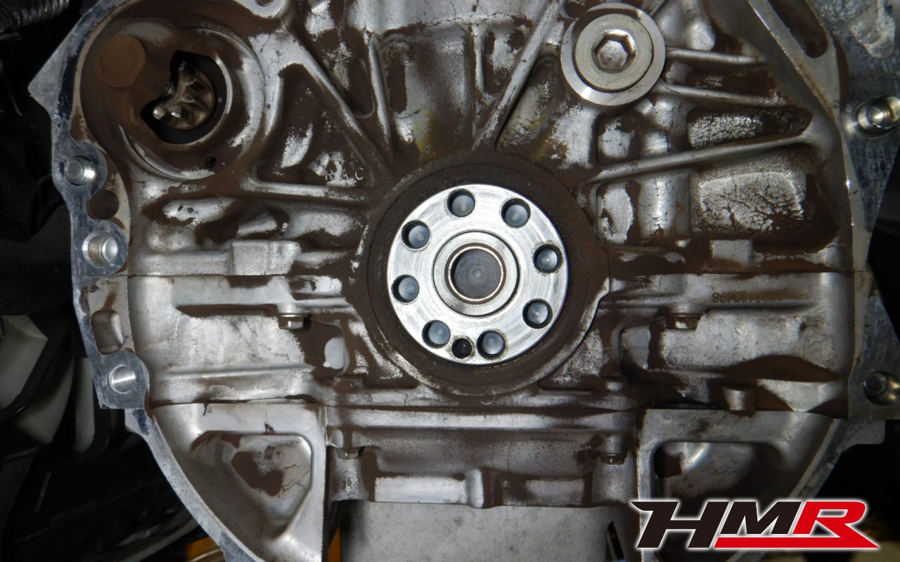 エンジン側のクランクシャフトリアオイルシール周辺はかなり汚れていますね。