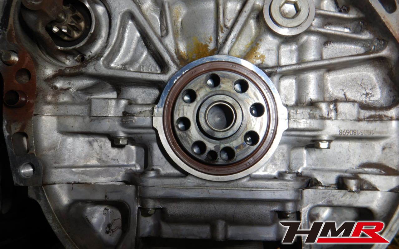 クランクシャフトリアオイルシールを交換していきます。取り外してみると表面にヒビが入っていたりボロボロになっていました。同時に交換しておきたい箇所ですね。
