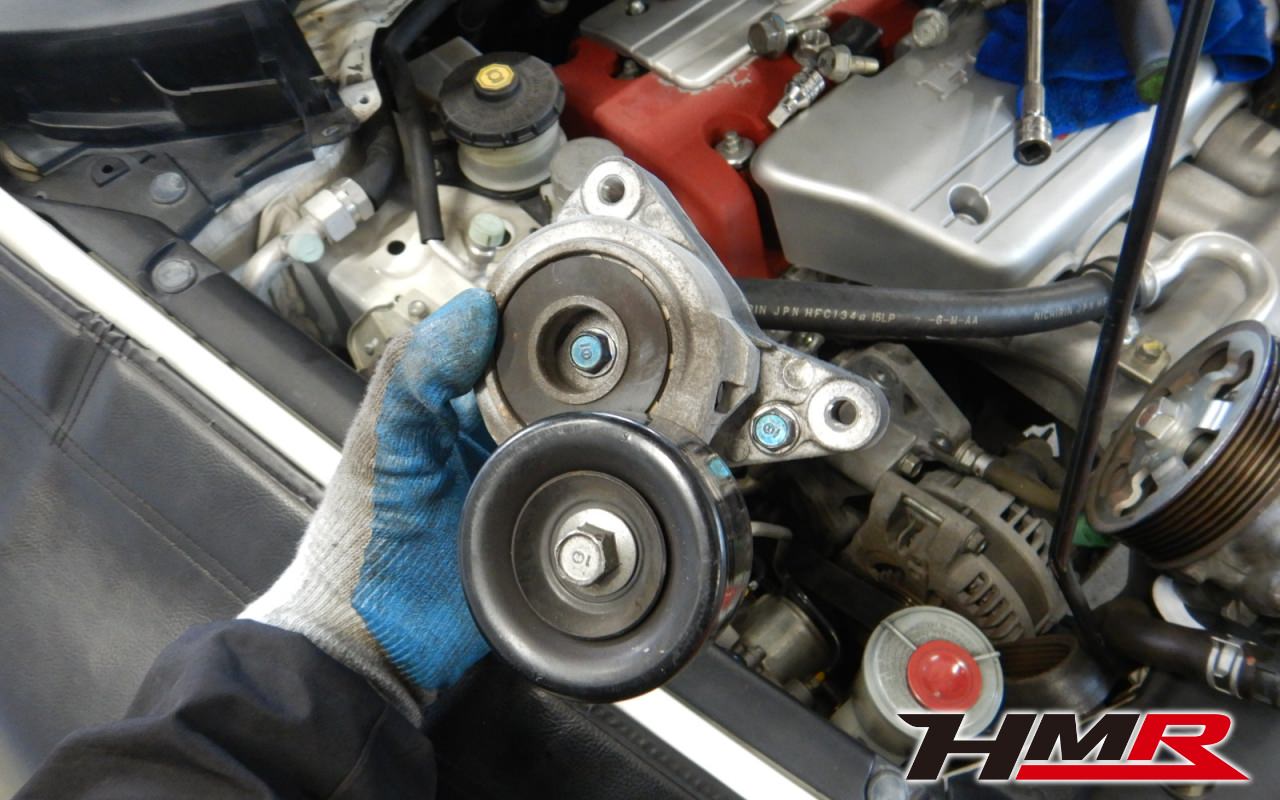 お客様から「暖気時にエンジンの振動が気になる」と今回の依頼時にご相談がありました。FD2では補機ベルトの張りを維持するオートテンショナーの摩耗による振動や異音といったトラブルが見受けられます。
