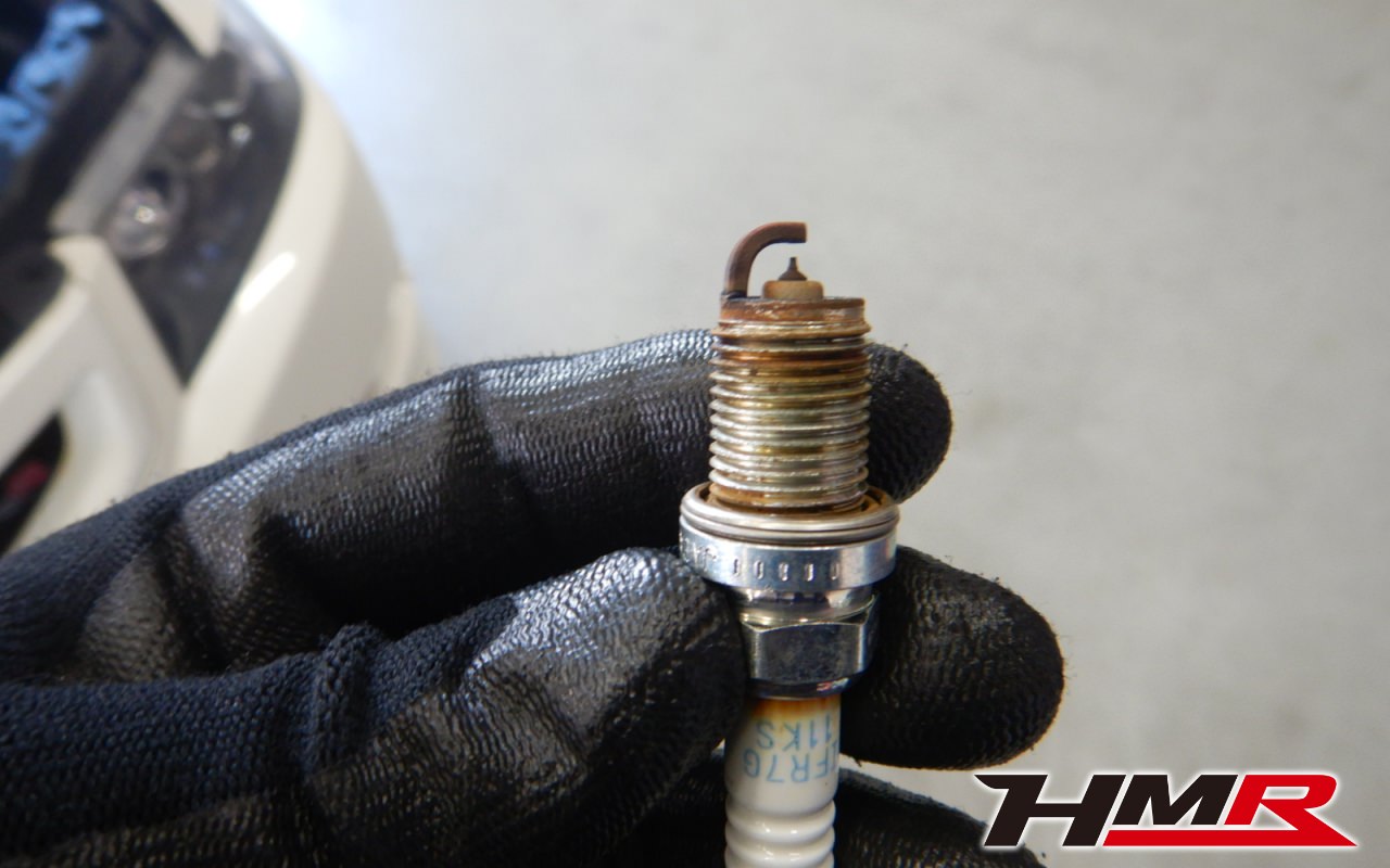 続いてプラグの点検を行いました。4本とも特に問題ありませんでした。先端の部分がひどく汚れてしまうとエンジンが掛かりづらくなったり、走行中に失火が起こり故障の原因となります。エンジンが掛かりづらくなるなどの症状が出た場合は当店にご相談ください。