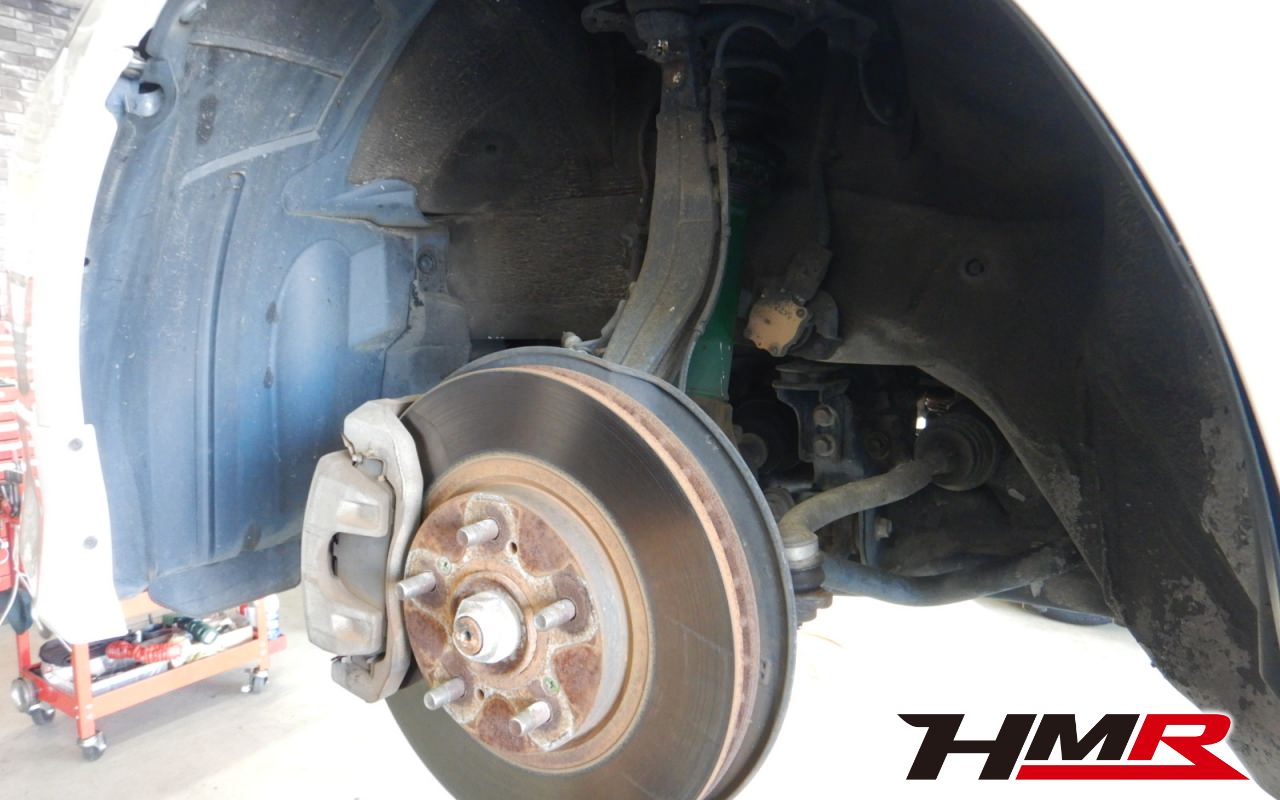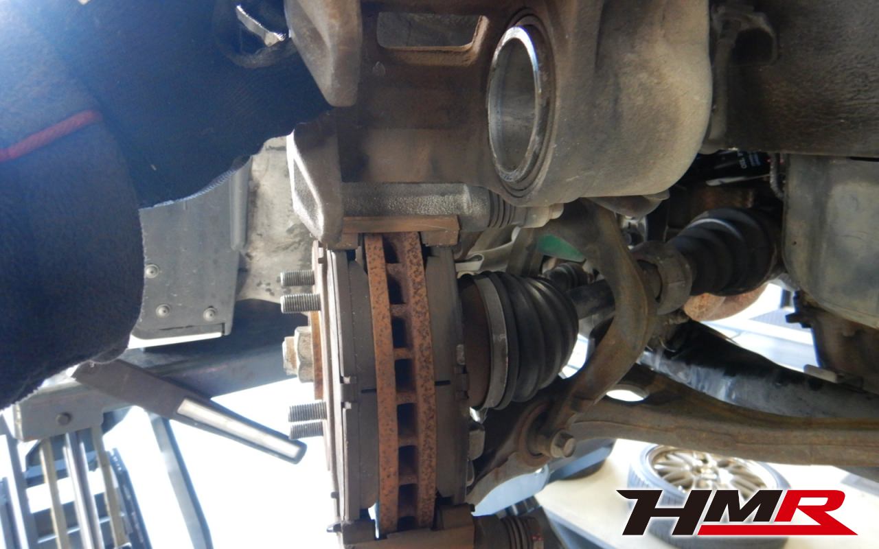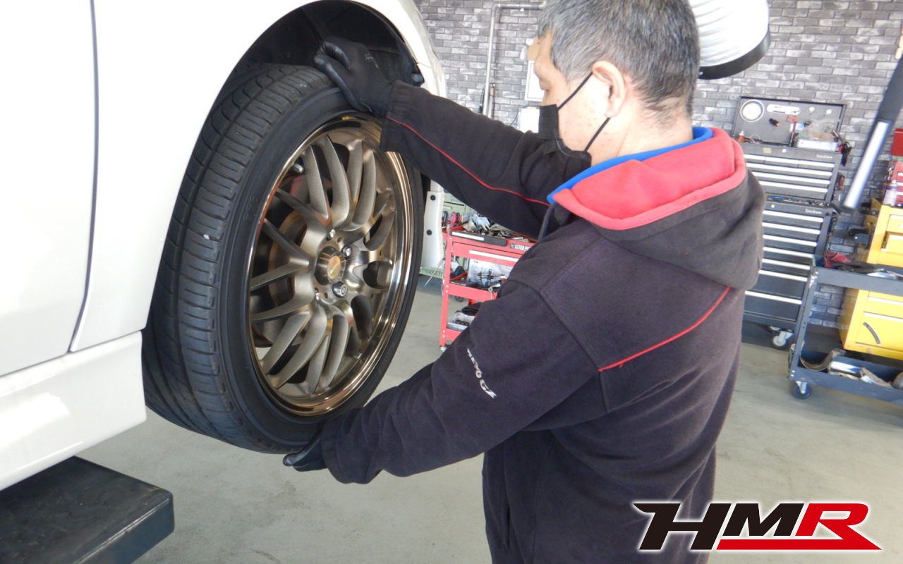 続いてリフトアップして足廻りをチェックしていきます。まず最初にタイヤを縦横に揺らしてハブベアリングとボールジョイントのガタがないかチェックを行います。特に問題ありませんでした。走行中に異音やハンドルのガタつきなどを感じた場合は当店へお早めにご相談下さい。