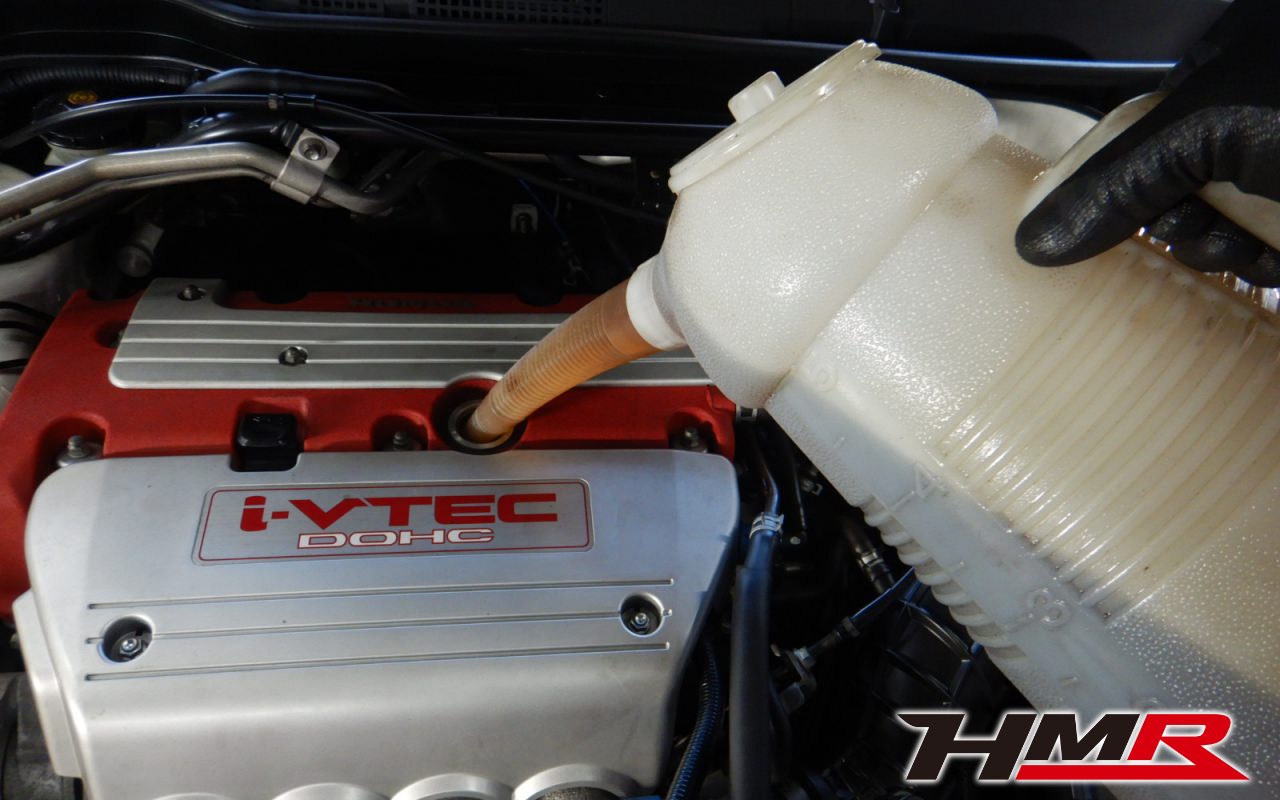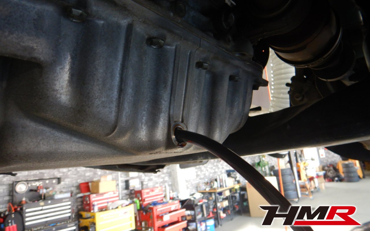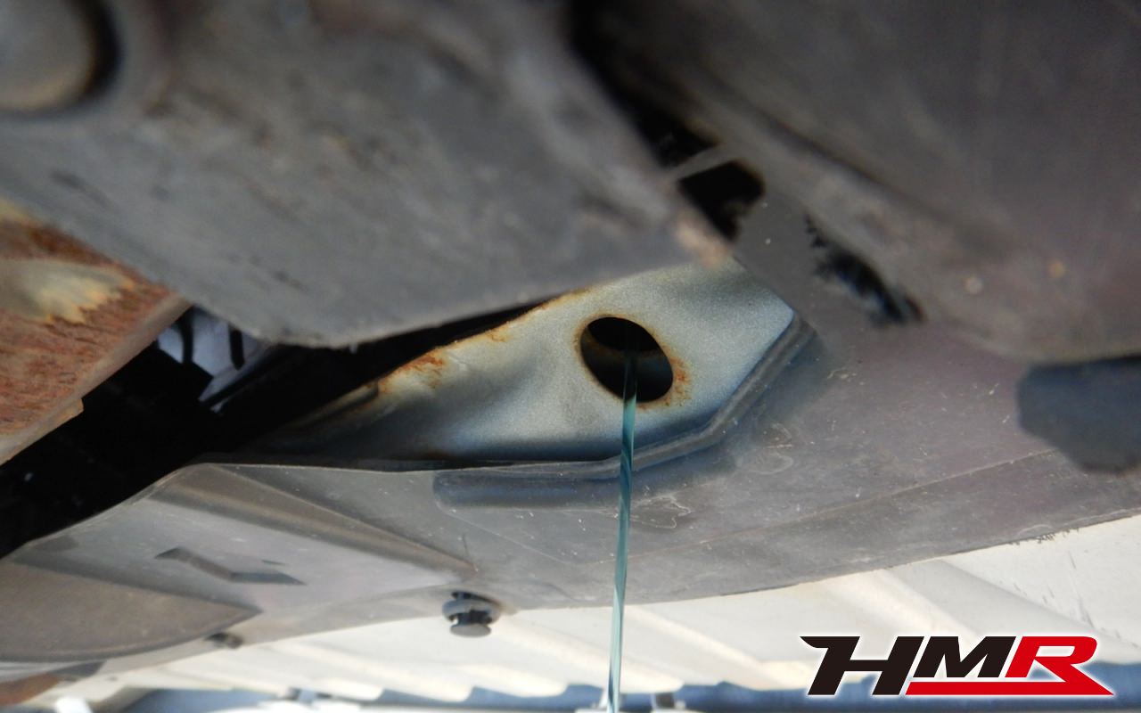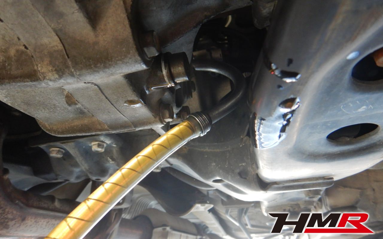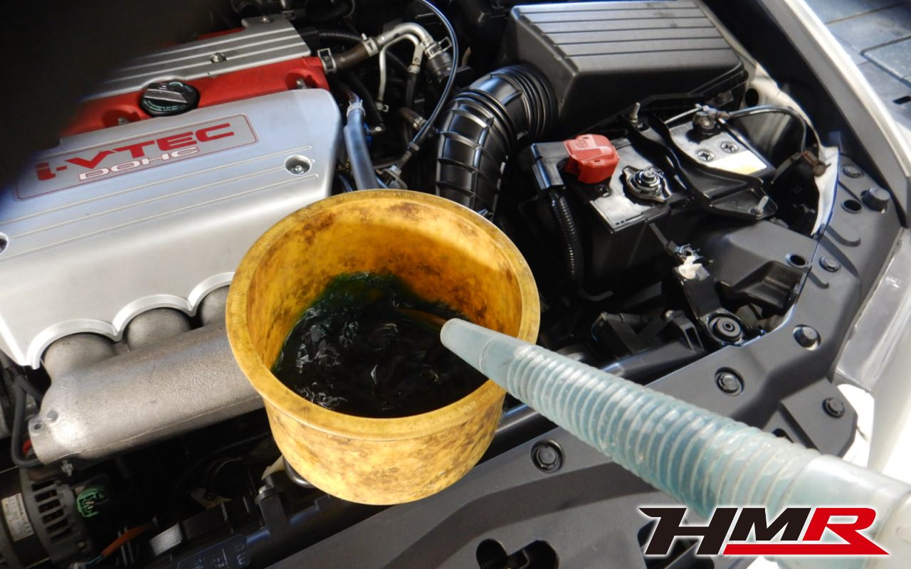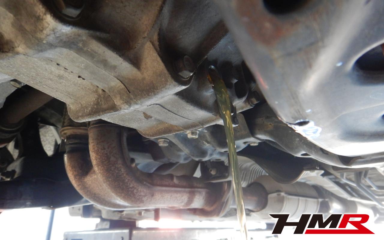 HMRではクルマに応じて、納車前点検でエンジンオイル・ブレーキフルード・ミッションオイル・ラジエタークーラントを新品交換しています。油脂類がリフレッシュされていれば納車してすぐのドライブも安心して楽しめますね。まずエンジンオイルから抜いていきます。エンジンオイルはエンジン内部の潤滑および冷却を行います。定期的な点検を行わず走り続けるとエンジンパワー低下や燃費悪化の原因となります。使用状況によりますが半年または5,000kmでの交換をおススメいたします。