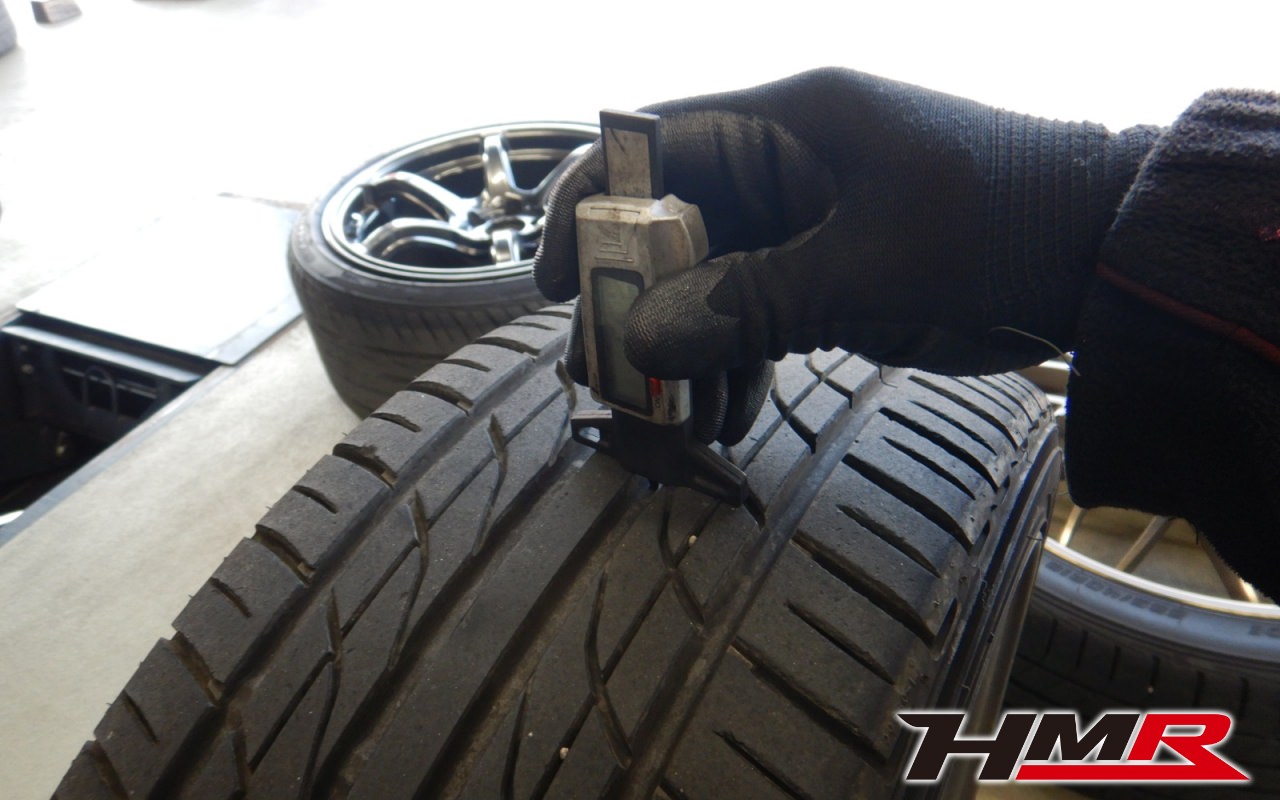 タイヤ溝の残量をチェックしていきます。右側の前後タイヤは6mm前後で左側は4mm前後でした。 残り溝はありましたが、ゴムが劣化してひび割れておりましたので交換をお勧めさせていただき後ほど新しいタイヤに交換いたしました。