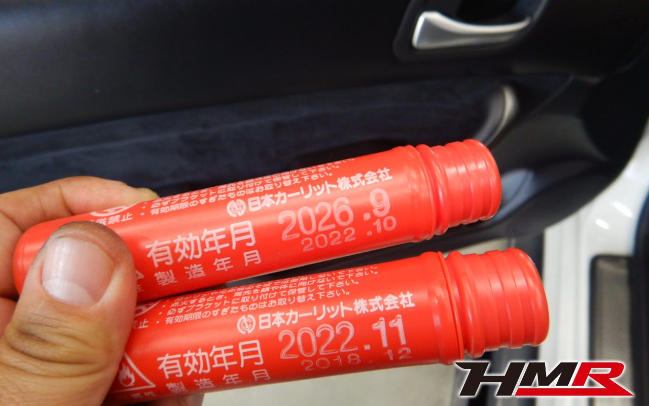 サンフレアの有効期限が切れていたので交換します。サンフレアは有効期限が切れていても車載されていれば車検は問題ありません。但しいざとなった時に使えるとは限りませんのでHMRでは有効期限が切れたものは交換させていただいております。