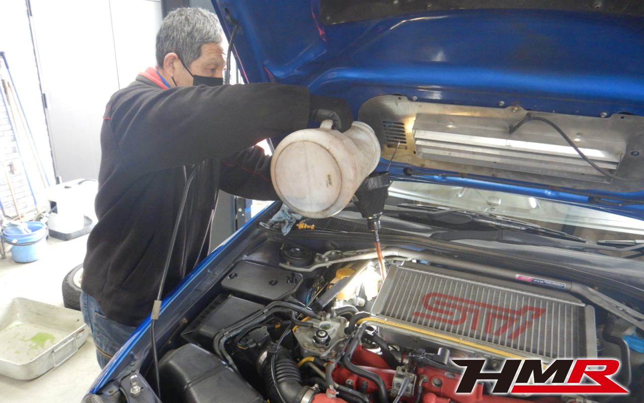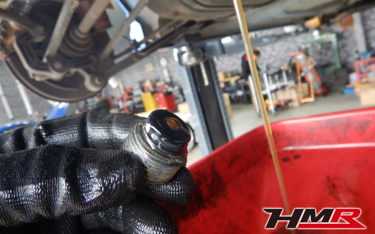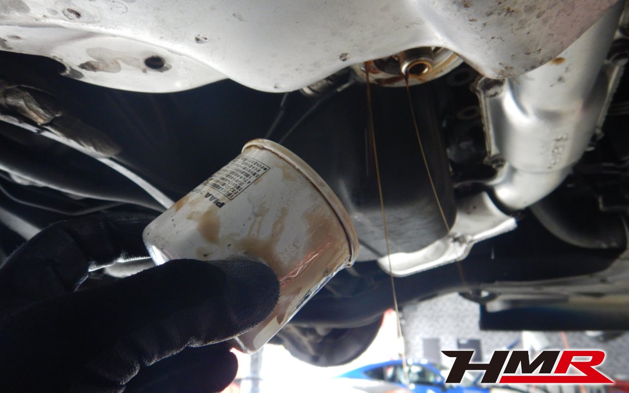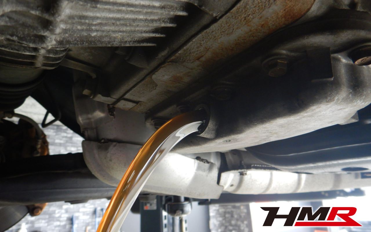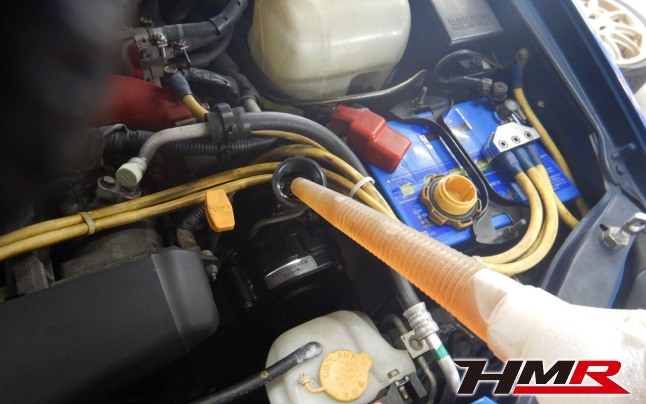 HMRではクルマに応じて、納車前点検でエンジンオイル・ブレーキフルード・ミッションオイル・ラジエタークーラントを新品交換しています。油脂類がリフレッシュされていれば納車してすぐのドライブも安心して楽しめますね。まずエンジンオイルから抜いていきます。エンジンオイルはエンジン内部の潤滑および冷却を行います。定期的な点検を行わず走り続けるとエンジンパワー低下、燃費悪化の原因となります。使用状況によりますが半年または5,000kmでの交換をおススメいたします。