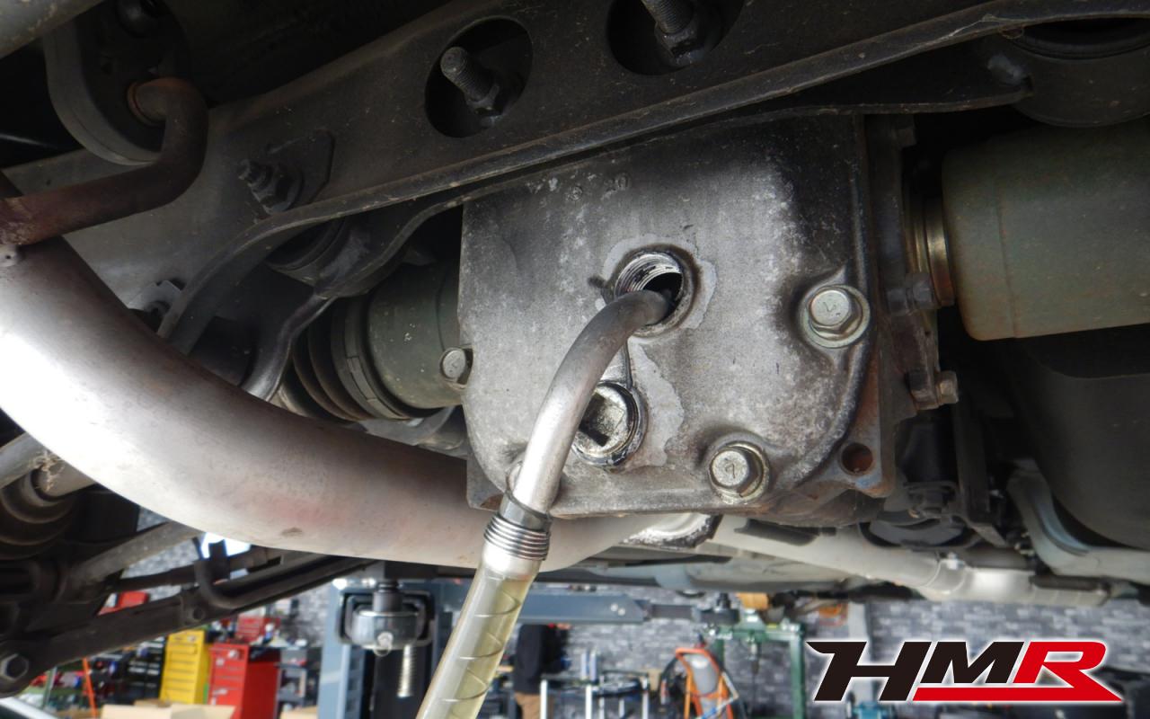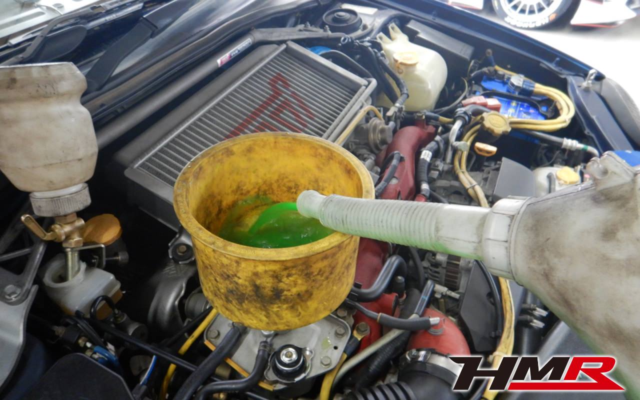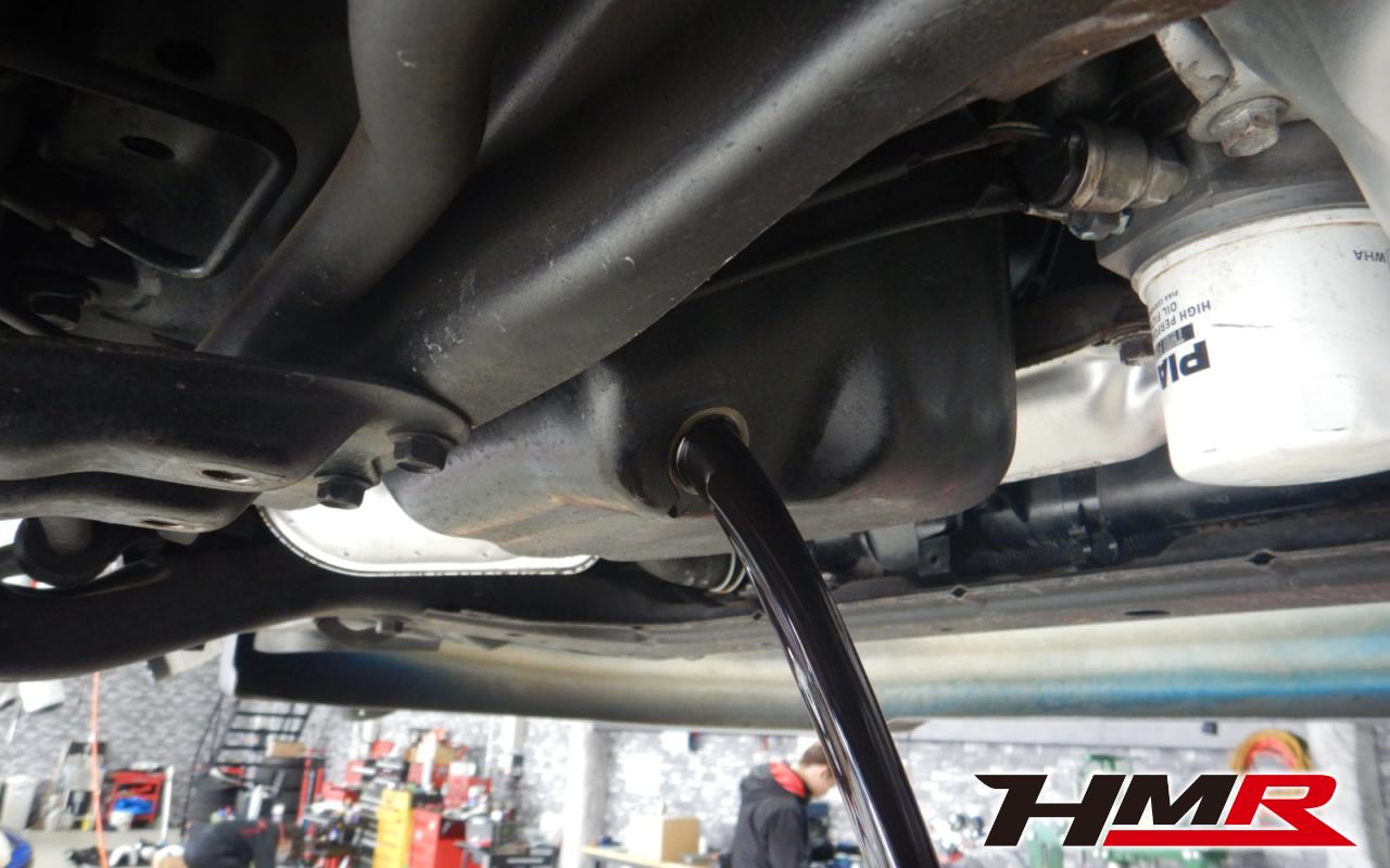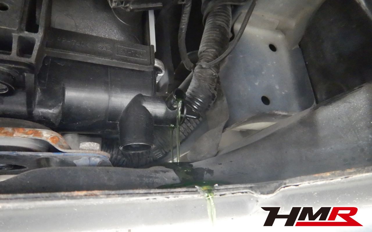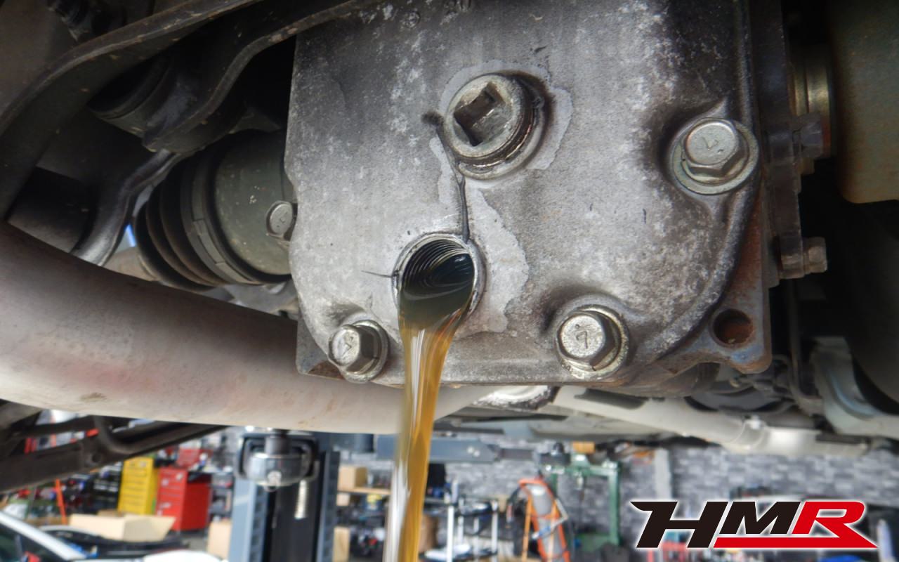 HMRではクルマに応じて、納車前点検でエンジンオイル・ブレーキフルード・ミッションオイル・ラジエタークーラントを新品交換しています。油脂類がリフレッシュされていれば納車してすぐのドライブも安心して楽しめますね。まずエンジンオイルから抜いていきます。エンジンオイルはエンジン内部の潤滑および冷却を行います。定期的な点検を行わず走り続けるとエンジンパワー低下、燃費悪化の原因となります。使用状況によりますが半年または5,000kmでの交換をおススメいたします。