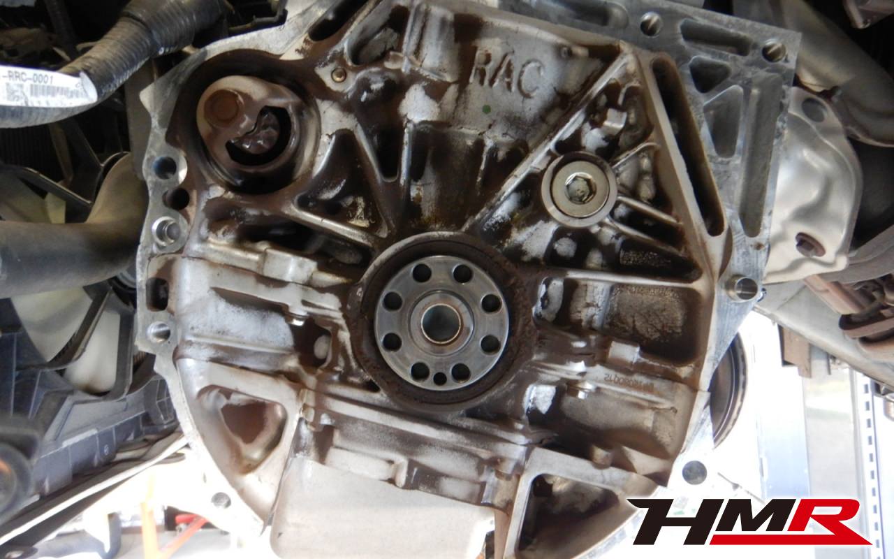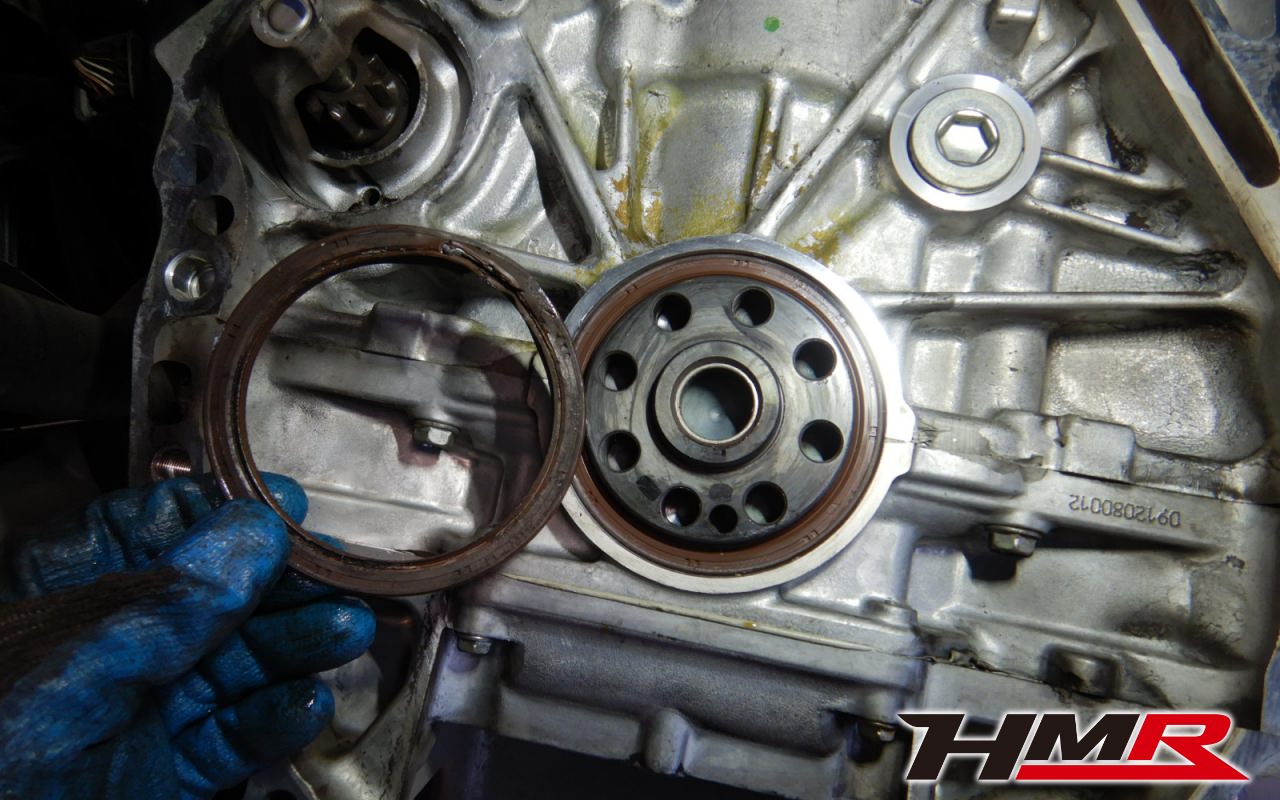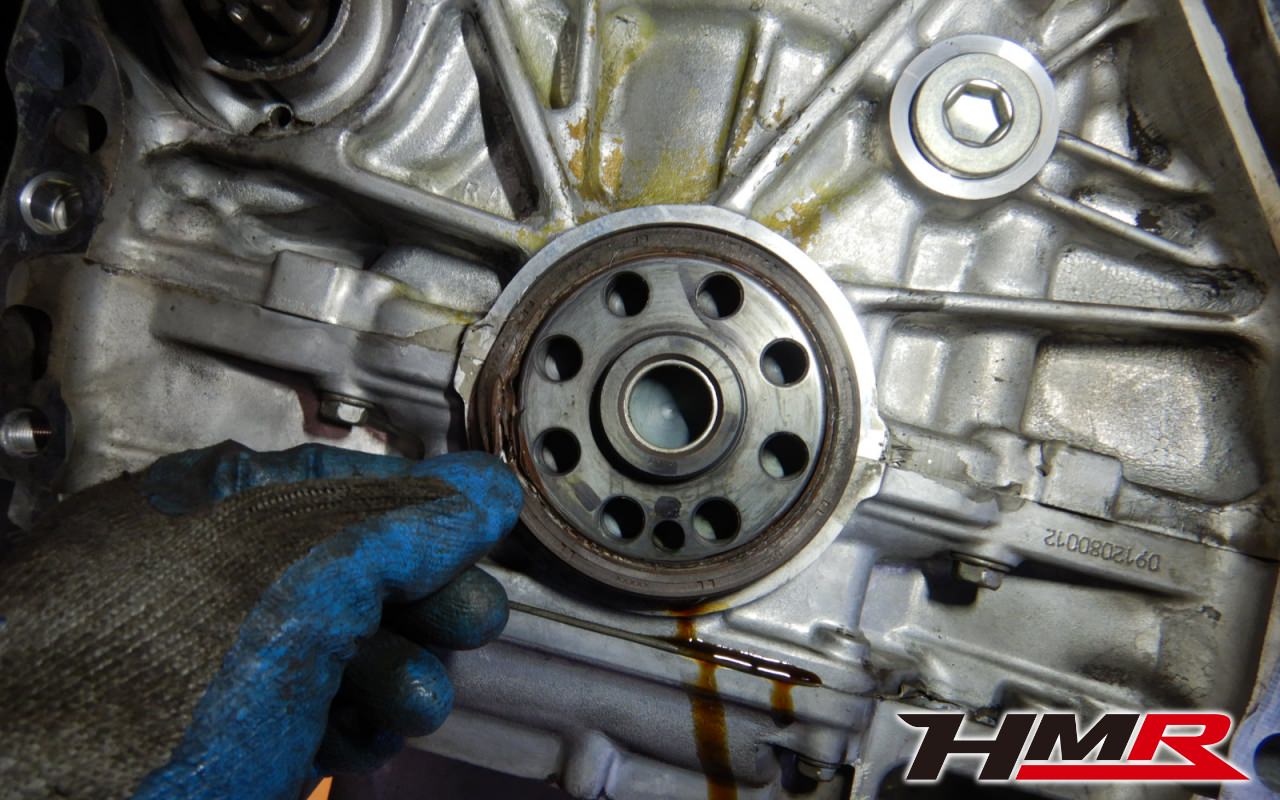 クランクシャフトリアオイルシールを交換していきます。取り外してみると表面にヒビが入っていたりボロボロになっていました。そうでなくとも同時に交換しておきたい箇所ですね。