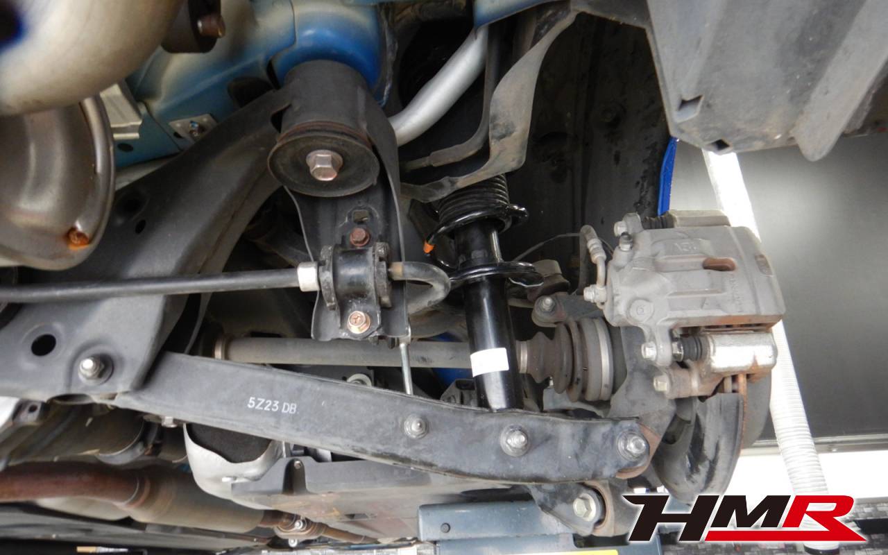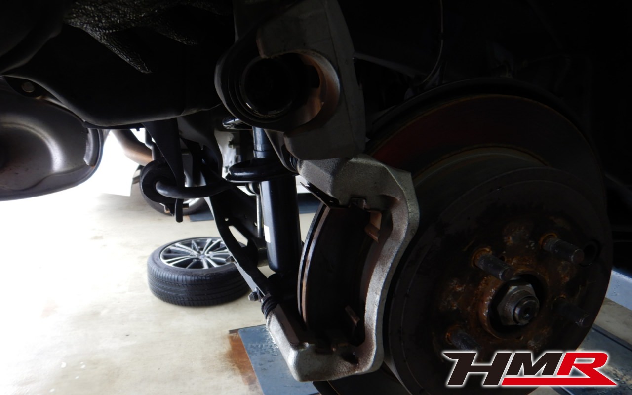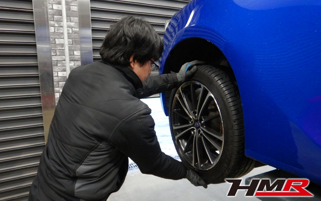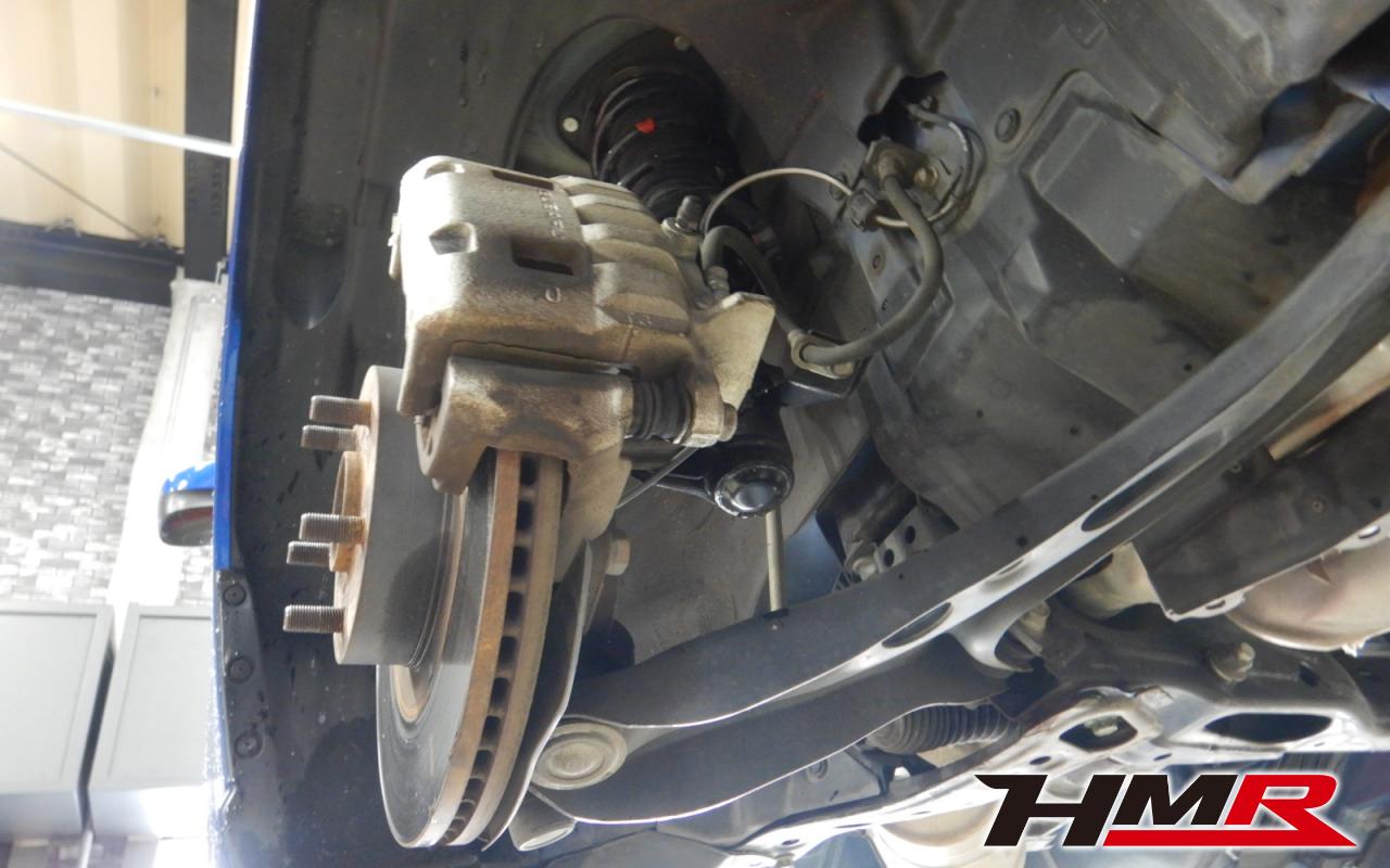 リフトアップして足廻りをチェックしていきます。まず最初にタイヤを縦横に揺らしてハブベアリングとボールジョイントのガタがないかチェックを行います。特に問題ありませんでした。走行中に異音やハンドルのガタつきなどを感じた場合は当店へお早めにご相談下さい。