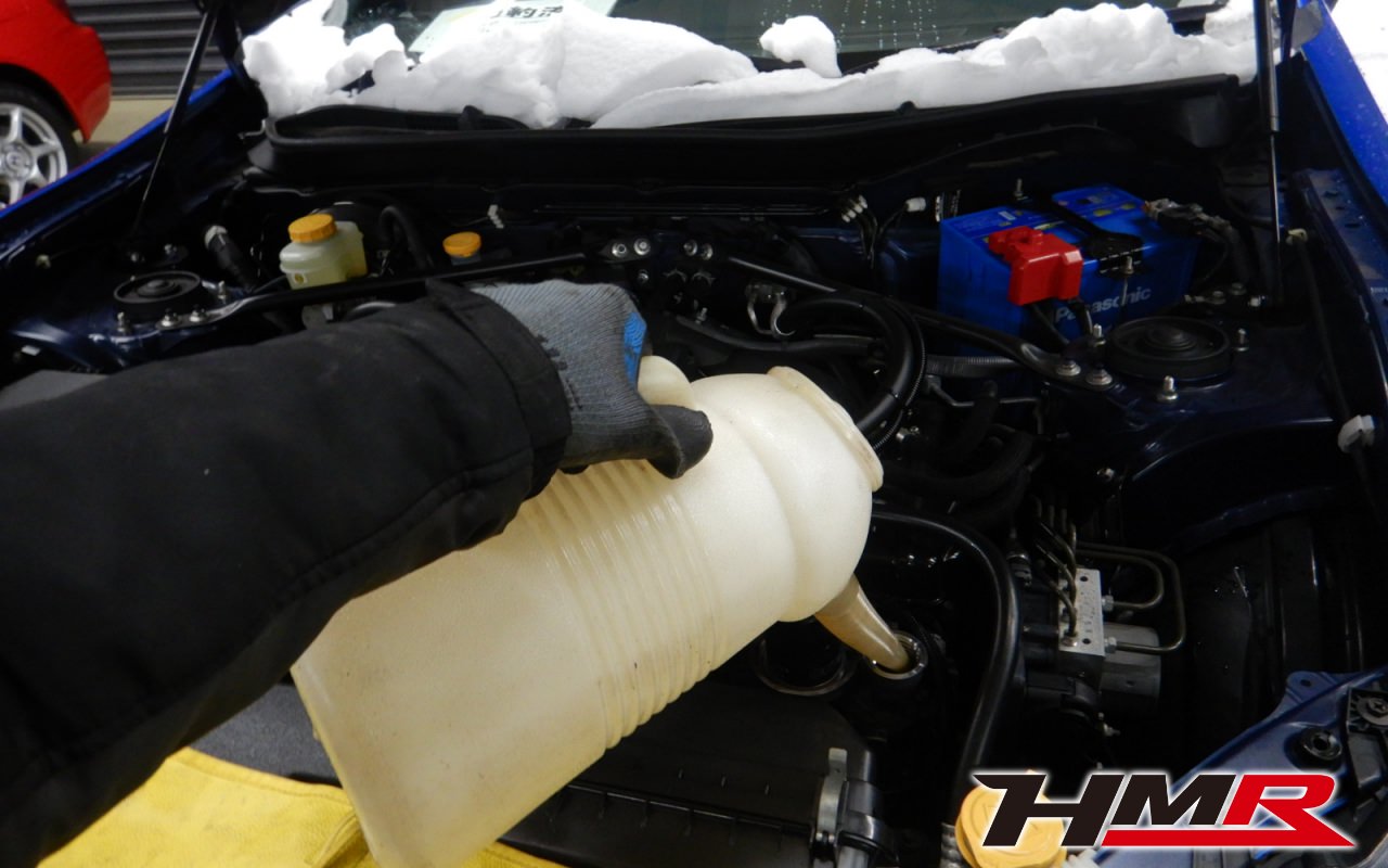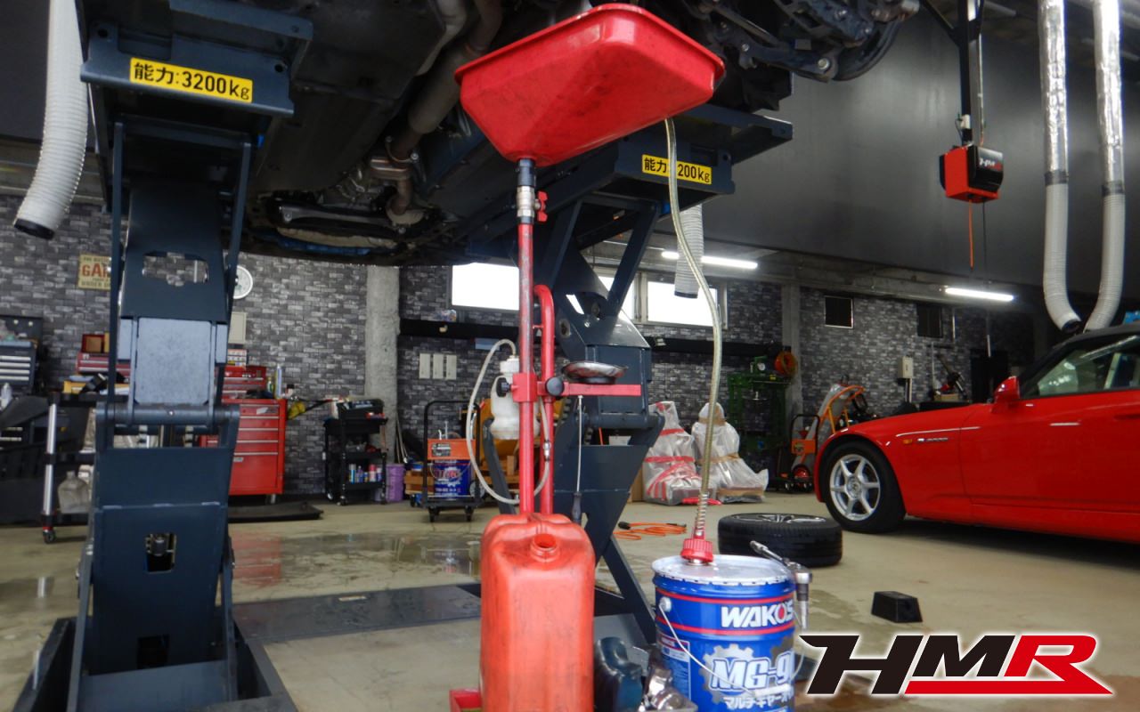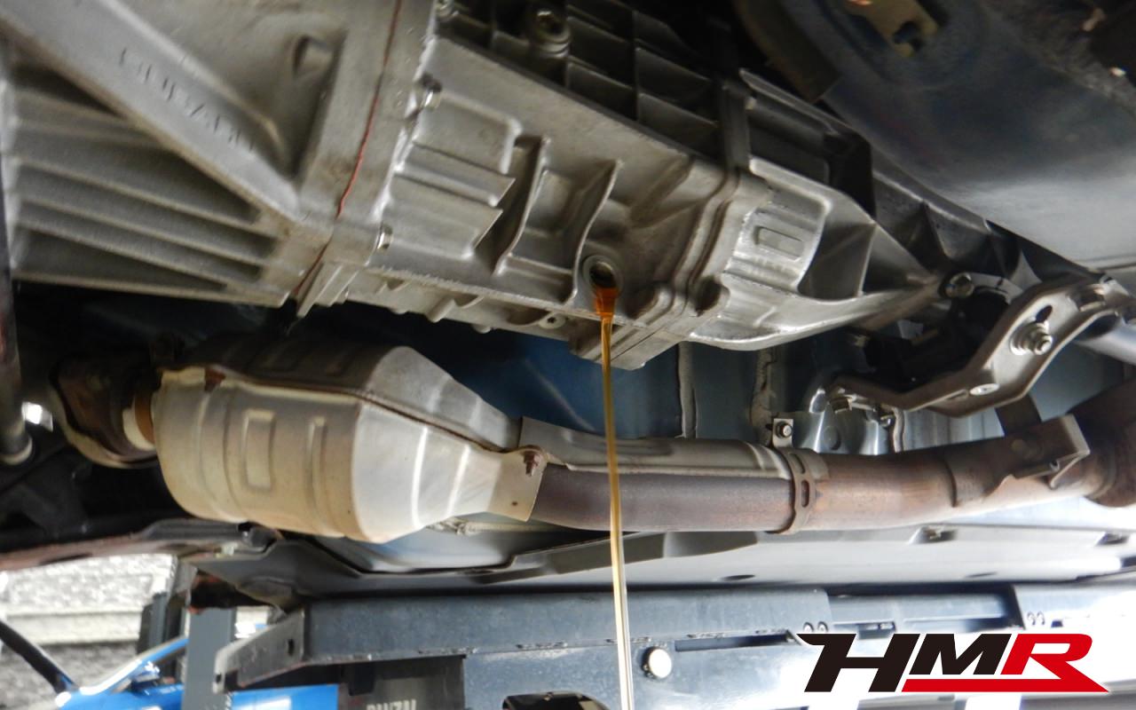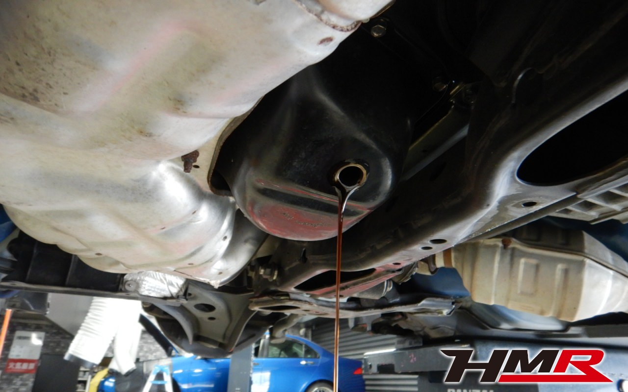 HMRでは納車前点検でエンジンオイルやブレーキフルード、ミッションオイル(MTのみ)、デフオイルを新品交換しています。油脂類がリフレッシュされていれば納車して直ぐに楽しいドライブに行くことも出来ますね。まずはエンジンオイルから交換していきます。エンジンオイルはエンジン内部の潤滑・清掃および冷却をおこないます。定期的な交換を行わず走り続けると燃費悪化やパワーダウンからのエンジン不調などの重大な故障に繋がります。使用状況によりますが半年または5,000kmでの交換をおススメいたします。