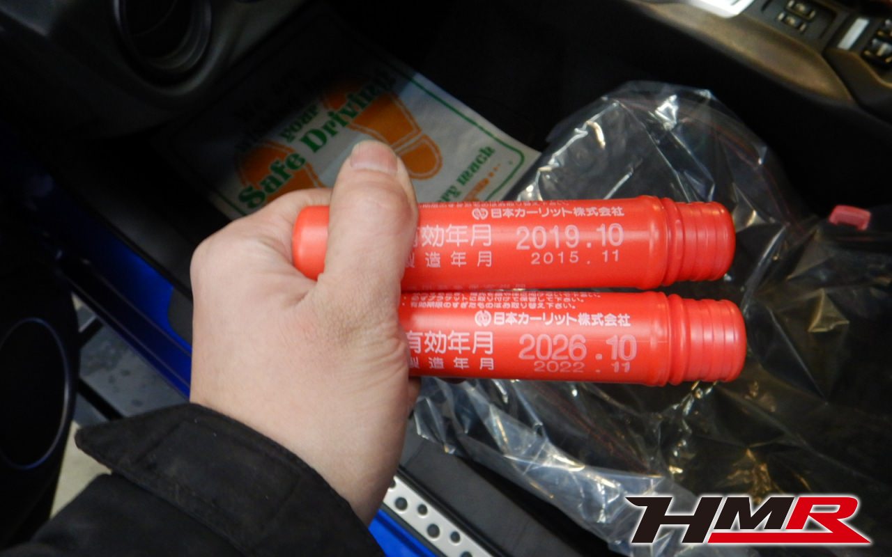 サンフレアを交換しました。サンフレアは有効期限が切れていても車載されていれば車検は問題ありません。但しいざとなった時に使えるとは限りませんのでHMRでは有効期限が切れたものは交換させていただいております。