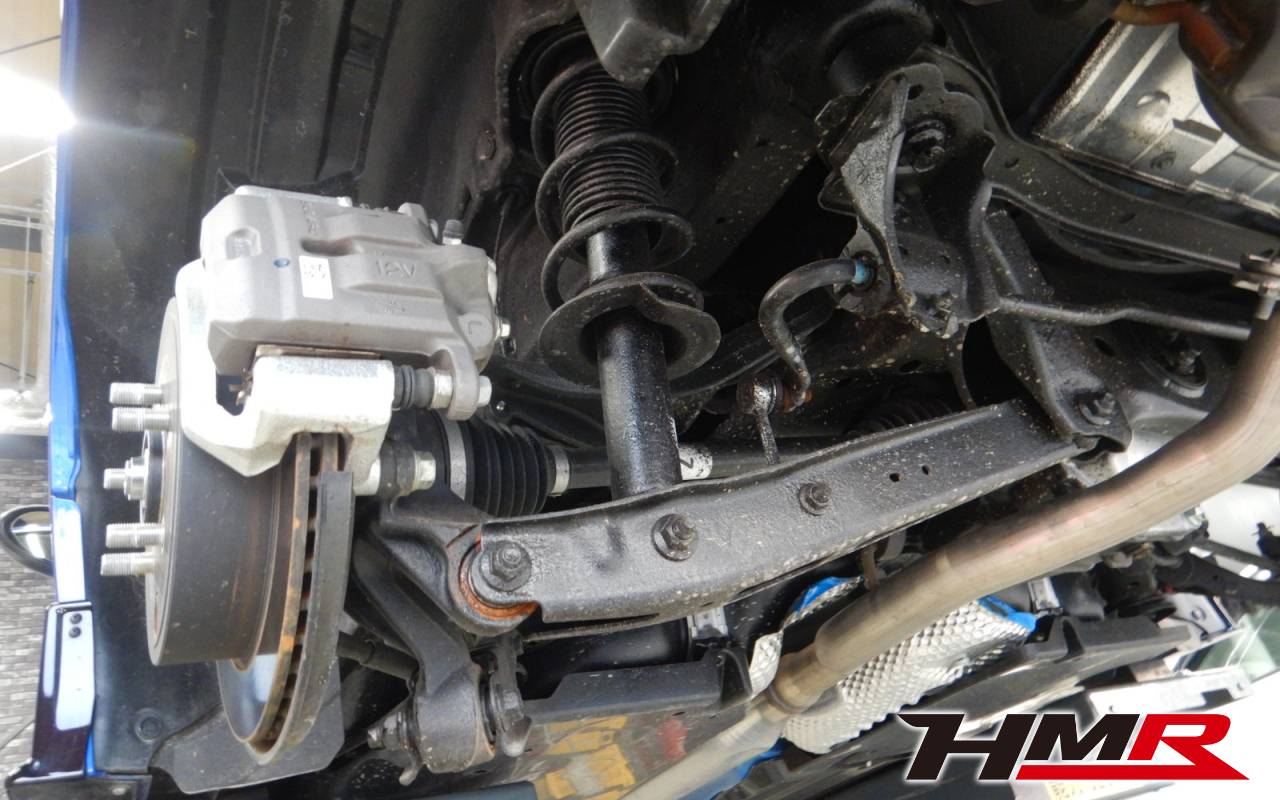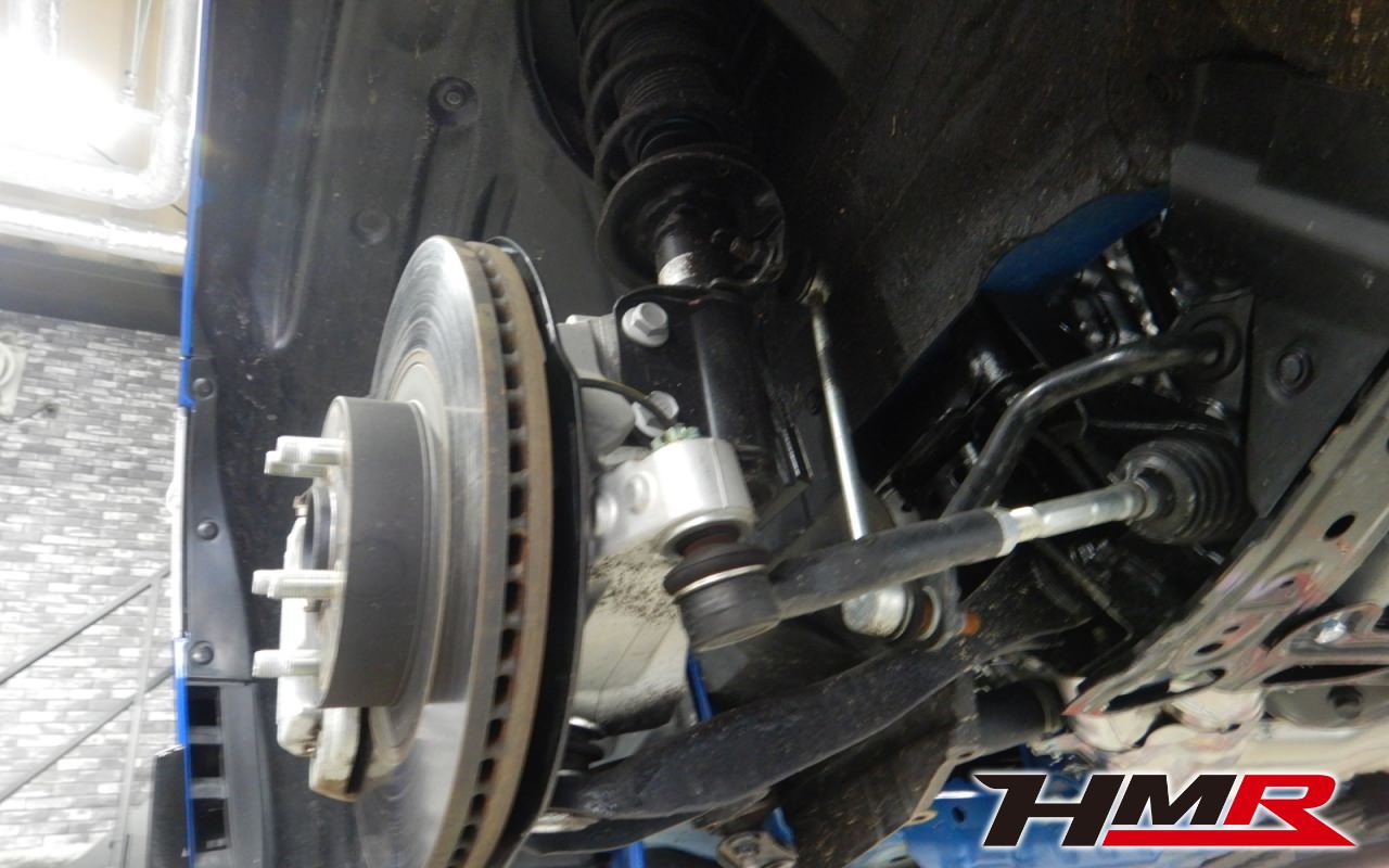 続いてリフトアップして足廻りをチェックしていきます。まず最初にタイヤを縦横に揺らしてハブベアリングとボールジョイントのガタがないかチェックを行います。特に問題ありませんでした。走行中に異音やハンドルのガタつきなどを感じた場合は当店へお早めにご相談下さい。