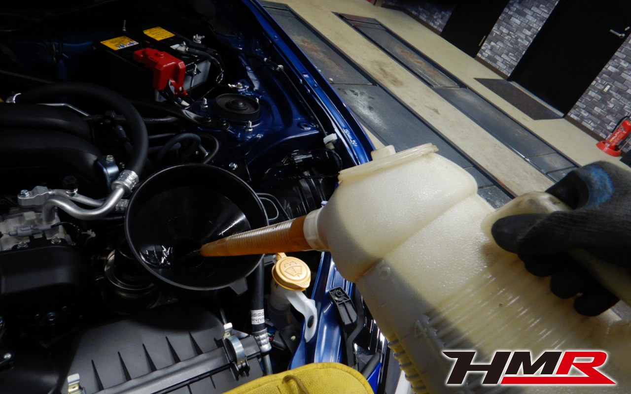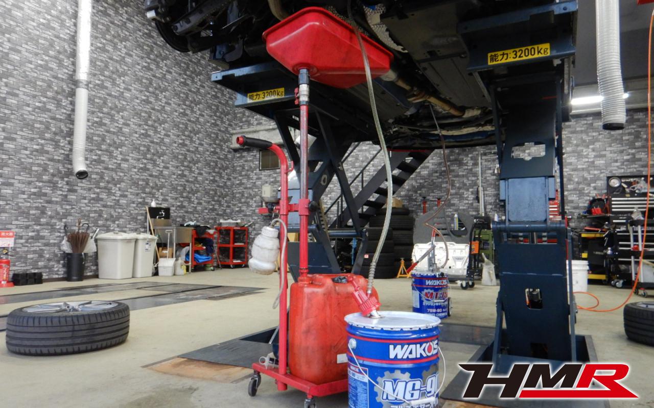 HMRでは納車前点検でエンジンオイルやブレーキフルード、ミッションオイル(MTのみ)、デフオイルを新品交換しています。油脂類がリフレッシュされていれば納車して直ぐに楽しいドライブに行くことも出来ますね。まずはエンジンオイルから交換していきます。エンジンオイルはエンジン内部の潤滑・清掃および冷却をおこないます。定期的な交換を行わず走り続けると燃費悪化やパワーダウンからのエンジン不調などの重大な故障に繋がります。使用状況によりますが半年または5,000kmでの交換をおススメいたします。