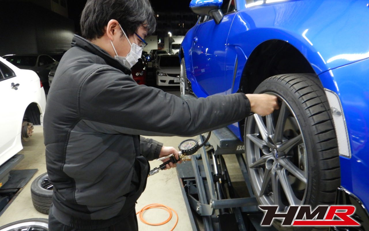 タイヤの空気圧チェックをしています。タイヤのエアはゆっくり少しずつ抜けていきます。ガソリンスタンドで簡単に入れられますので1ヶ月に1度のチェックをおススメいたします。