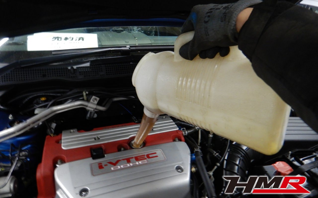 HMRではクルマに応じて、納車前点検でエンジンオイル・ブレーキフルード・ミッションオイル・ラジエタークーラントを新品交換しています。油脂類がリフレッシュされていれば納車してすぐのドライブも安心して楽しめますね。まずエンジンオイルから抜いていきます。エンジンオイルはエンジン内部の潤滑および冷却を行います。定期的な点検を行わず走り続けるとエンジンパワー低下や燃費悪化の原因となります。使用状況によりますが半年または5,000kmでの交換をおススメいたします。ミッションオイルも抜いていきます。ミッションオイルが劣化していくとギアの入りが悪くなったり、最悪ミッションのギアを痛めてしまいミッションブローに繋がります。 クーラント液を抜いていきます。 新しいミッションオイルを入れていきます。オイルはホンダ純正MTF-3になります。  エンジンオイルを入れていきます。エンジンオイルはWAKO’SプロステージS 100%化学合成油 10W-40を使用しています。  新しいクーラント液を入れていきます。 次にブレーキフルードを交換しました。フルードはDOT4を使用しています。交換タイミングは、車検毎をおススメしております。 タイヤ溝の残量をチェックしていきます。フロント2.2mm リア3.5mmとなります。 各タイヤの空気圧を調整していきます。空気圧は自然と少しずつ抜けていきますのでガソリンスタンドなどで定期的な点検を行うことをおススメします。 グローブボックス奥にあるエアコンフィルターも取り外したらゴミがびっしりと付着していましたので交換させていただきました。  サンフレアの有効期限が切れていたので交換します。サンフレアは有効期限が切れていても車載されていれば車検は問題ありません。但しいざとなった時に使えるとは限りませんのでHMRでは有効期限が切れたものは交換させていただいております。 以上で作業完了となります。S様、この度はアコードユーロR(CL7)ご契約ありがとうございました。ご納車まで今暫くお待ち下さい。