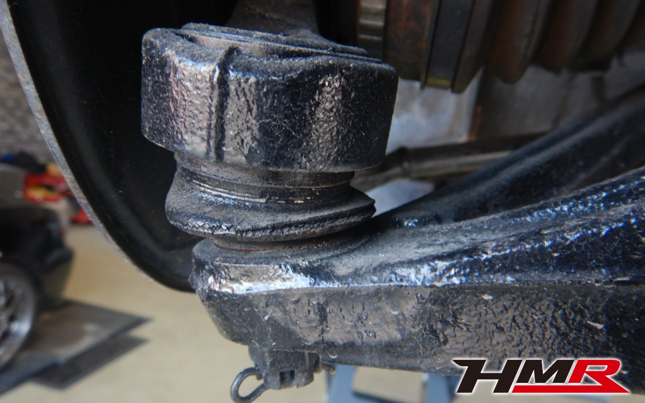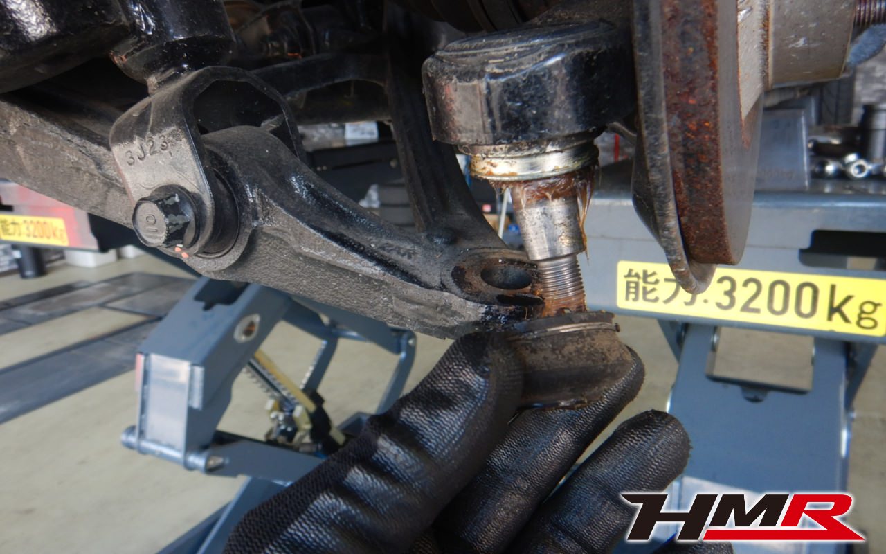 リアロアアームブーツにヒビが見つかりましたが、すぐの交換は必要ないのでまたタイミングを見て交換をオススメいたします。またリア左右ナックルロアアームブーツが切れていましたのでこちらは後ほど交換させていただきました。