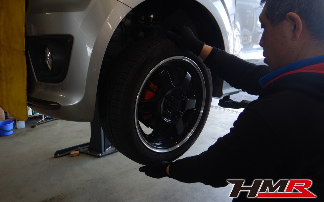 HMR(エイチエムアール)の栗原です。今回はレイズ15インチ Nabicマフラー装備のアルトワークス(HA36S)の納車前点検整備を行いました。担当メカニックはムラシタです。