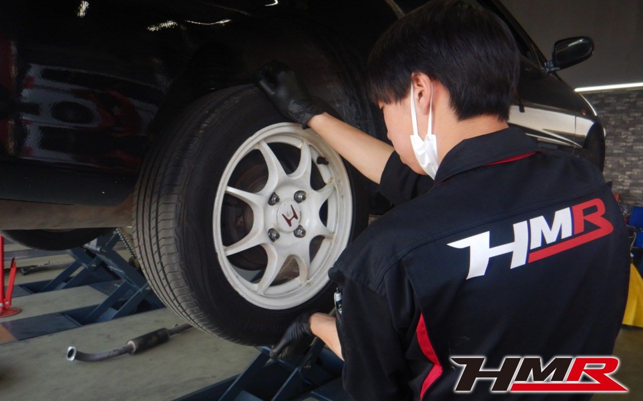 ハブベアリング・ボールジョイント、アーム・リンク類のガタ、ブッシュ・ブーツ類の劣化、エンジン・ミッション・デフからのオイル漏れと各マウント類、タイヤ溝の残量、空気圧の点検しました。