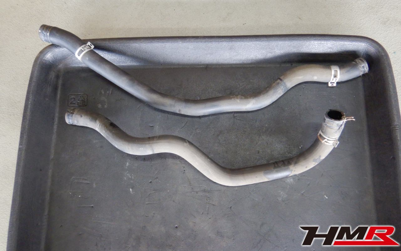 エンジンとラジエターの間にあったエアクリーナー、エアクリーナーボックス、インテークパイプを取り外しました。ラジエターとエンジンを繋げているラジエターホースを取り外します。