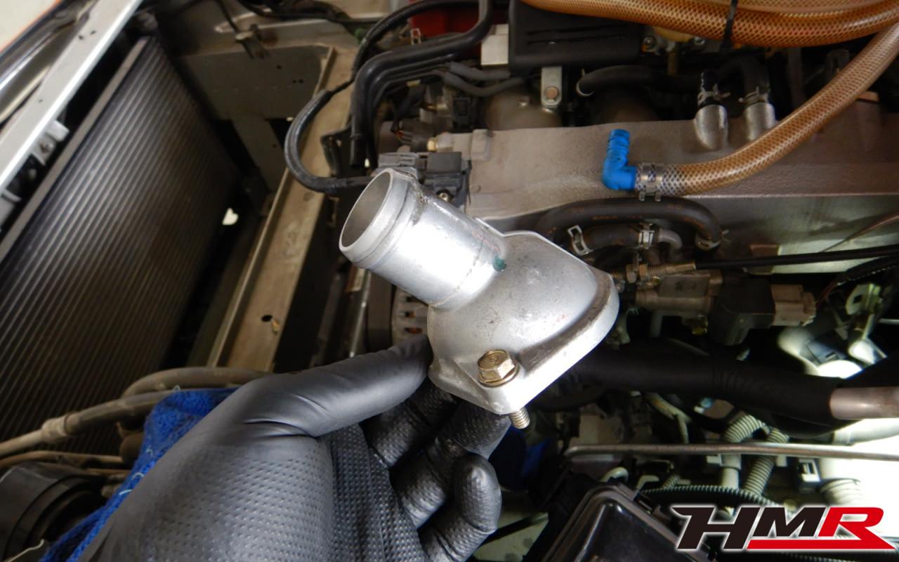 サーモスタットを取り外していきます。サーモスタットは、特定の温度でクーラントの通り道の弁を開け閉めしてクーラントを流す働きをしています。