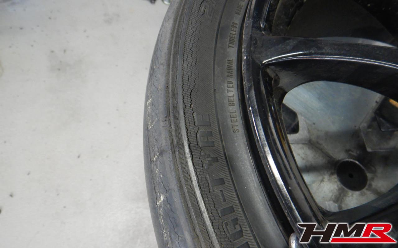 タイヤ溝の残量は、フロント3mm、リア1.5mmで大きなヒビが確認できました。こちらはお客様オーダーで後ほど新品タイヤに交換させていただきました。