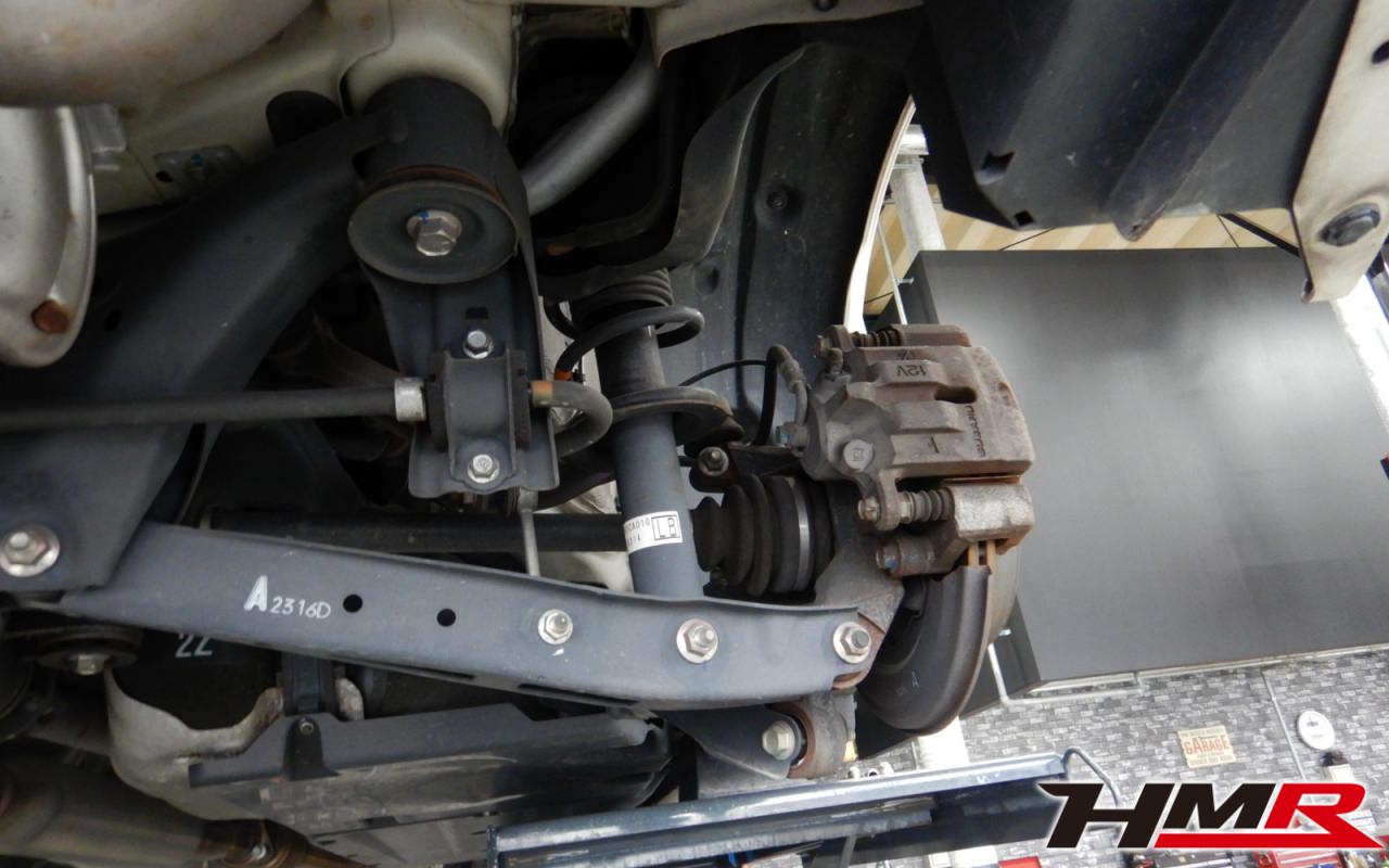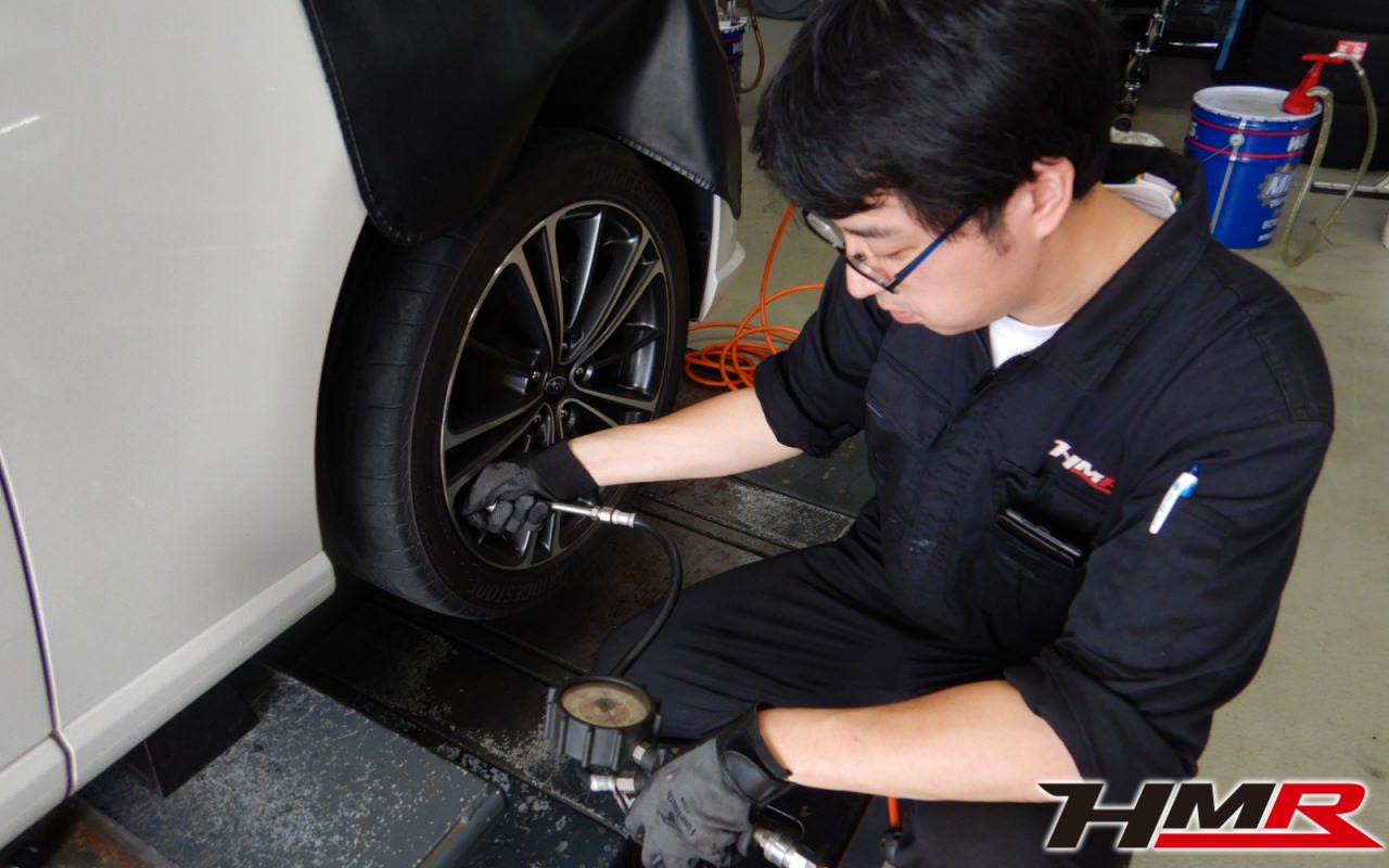 ハブベアリング・ボールジョイント、アーム・リンク類のガタ、ブッシュ・ブーツ類の劣化、エンジン・ミッション・デフからのオイル漏れと各マウント類、タイヤ溝の残量、空気圧の点検しました。