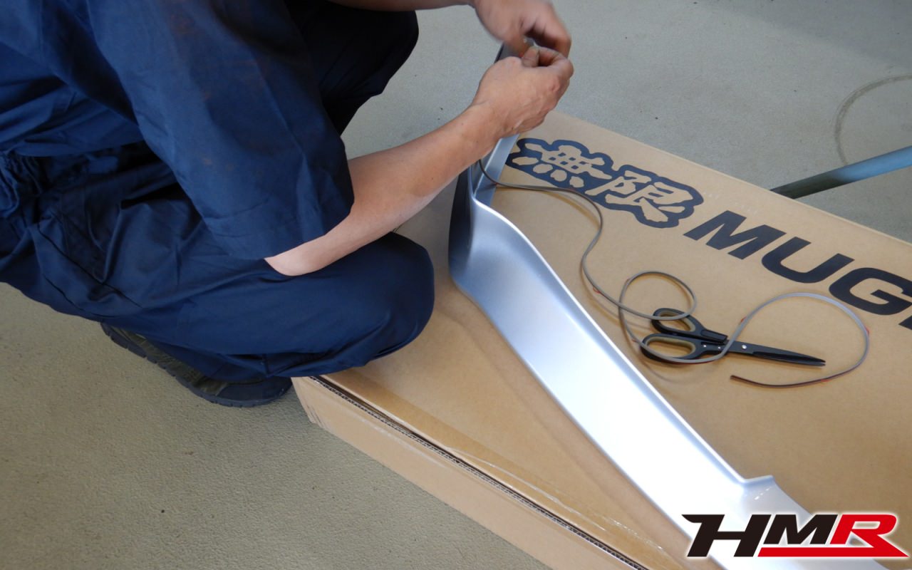 こちらもブレーキ同様に事前に取付け依頼があった無限スポイラーを装着していきます。各部に両面テープを貼り付けて 位置を慎重に合わせてボディに装着していきます。
