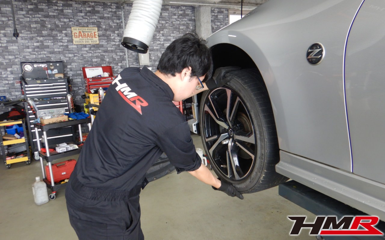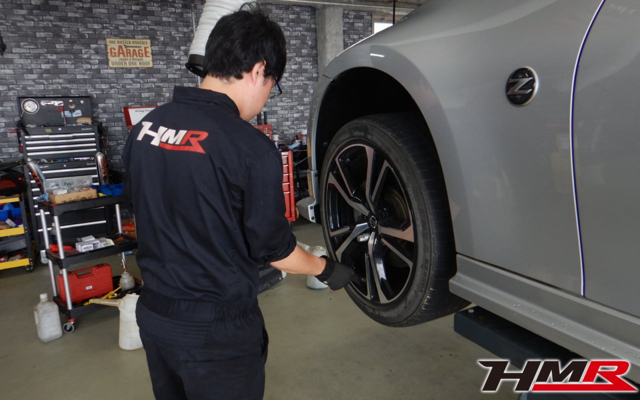 HMR(エイチエムアール)の栗原です。今回はレイズ製純正後期19インチ ニスモエアロ装備のフェアレディZ(Z34)の納車前点検整備を行いました。担当メカニックは堀口です。