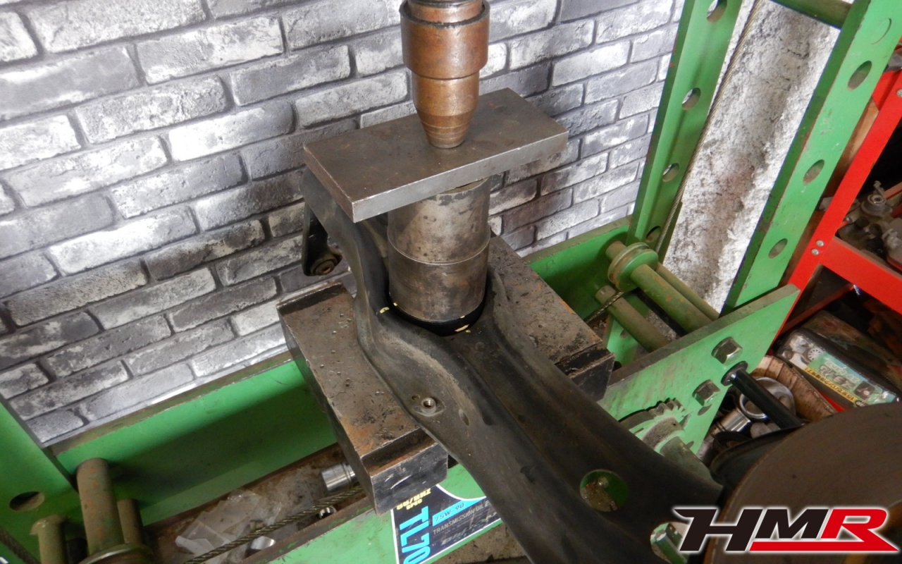 プレス機で古いブッシュを打ち抜いていきます。