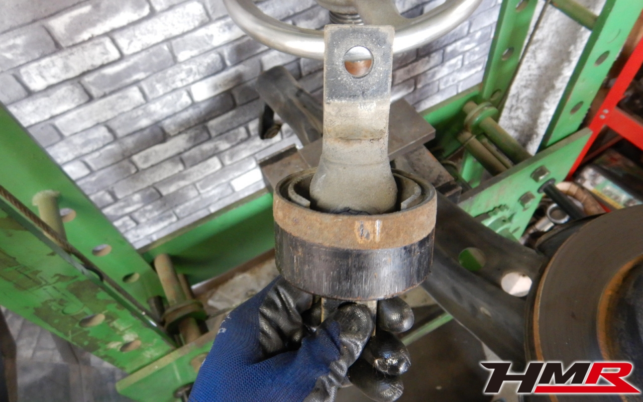 左右のトレーリングアームブッシュの様子をチェックしていきます。