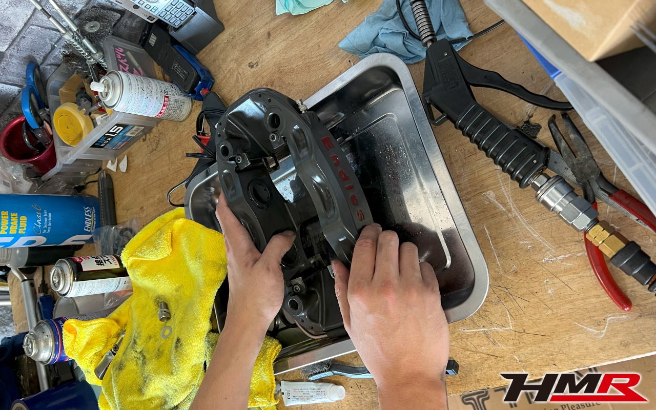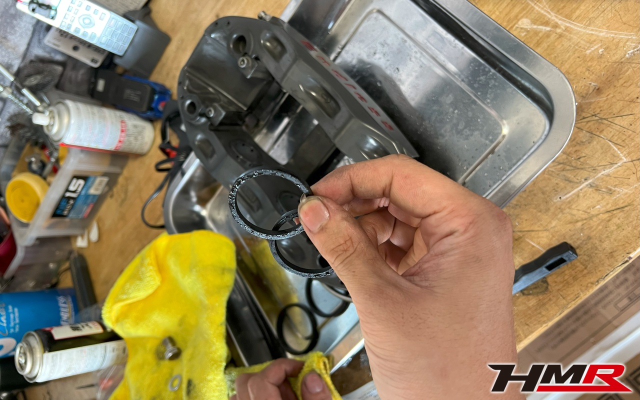 続いて、こちらはキャリパーのOHです。これも定期的に行います。キャリパーを全部バラして、ピストンを清掃しリング類やパッキン類を新品に交換して組み付けます。