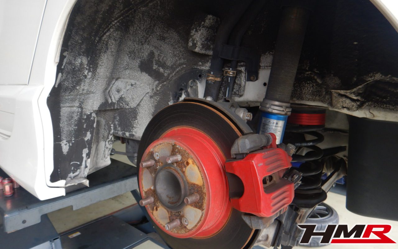 ハブベアリング・ボールジョイント、アーム・リンク類のガタ、ブッシュ・ブーツ類の劣化、エンジン・ミッション・デフからのオイル漏れと各マウント類、タイヤ溝の残量、空気圧の点検しました。
