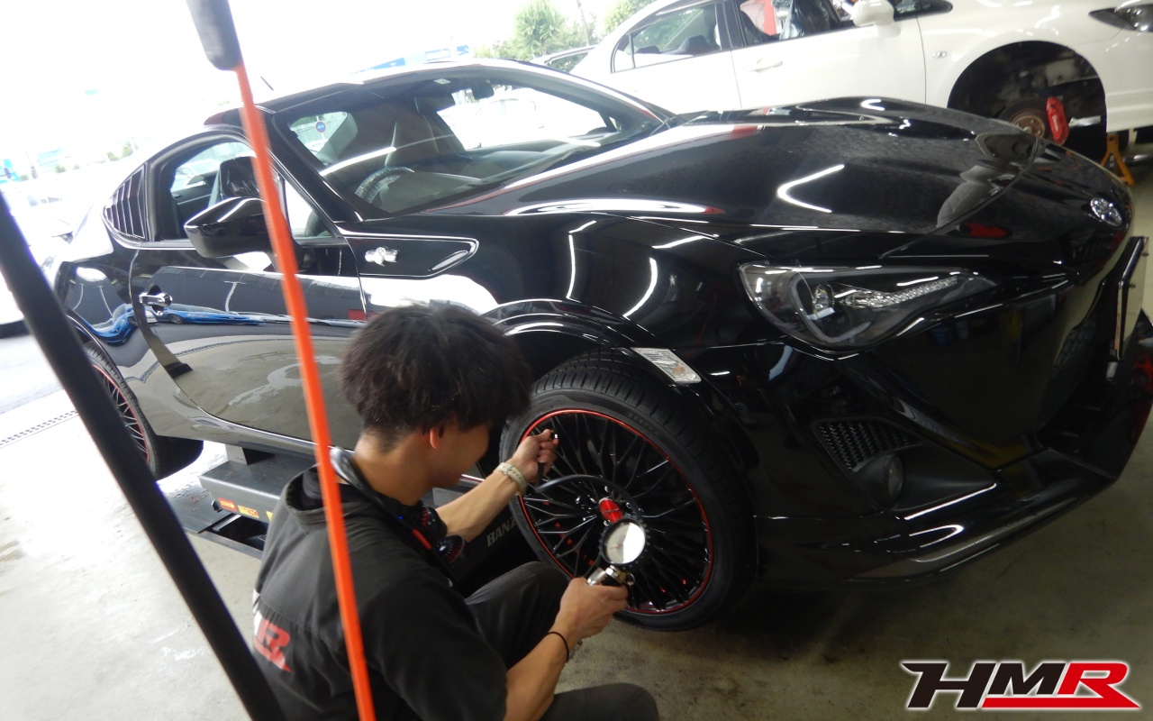 HMR(エイチエムアール)の秋山です。今回は6MT フジツボマフラー 社外18インチ装備のトヨタ 86(ZN6) 2.0GTの納車前点検整備を行いました。担当メカニックは大川です。