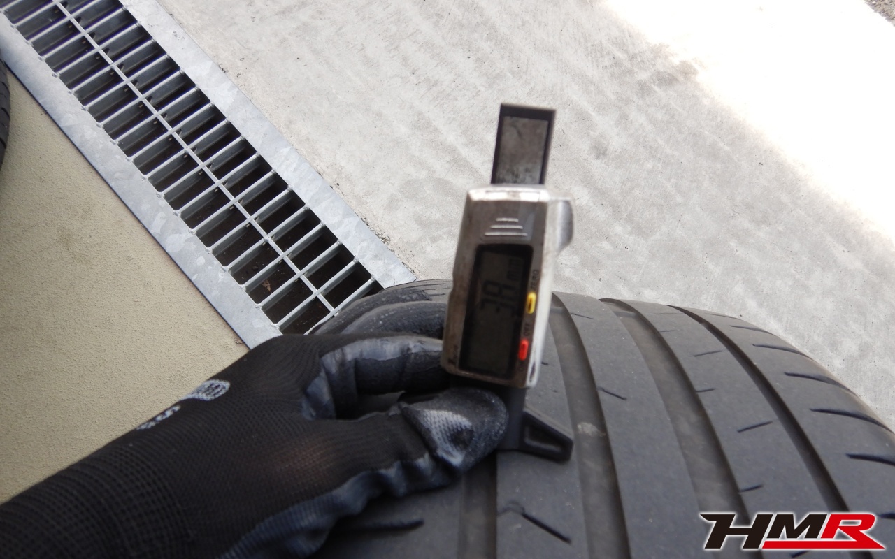 タイヤは2019年製TOYOのPROXES SPORTでサイズは前後255/35R18となっております。タイヤ溝の残量はおおよそフロント2.3mm・リア3.6mmでした。タイヤ溝も少なくなりヒビも見られますのでお早めの交換をおすすめします。