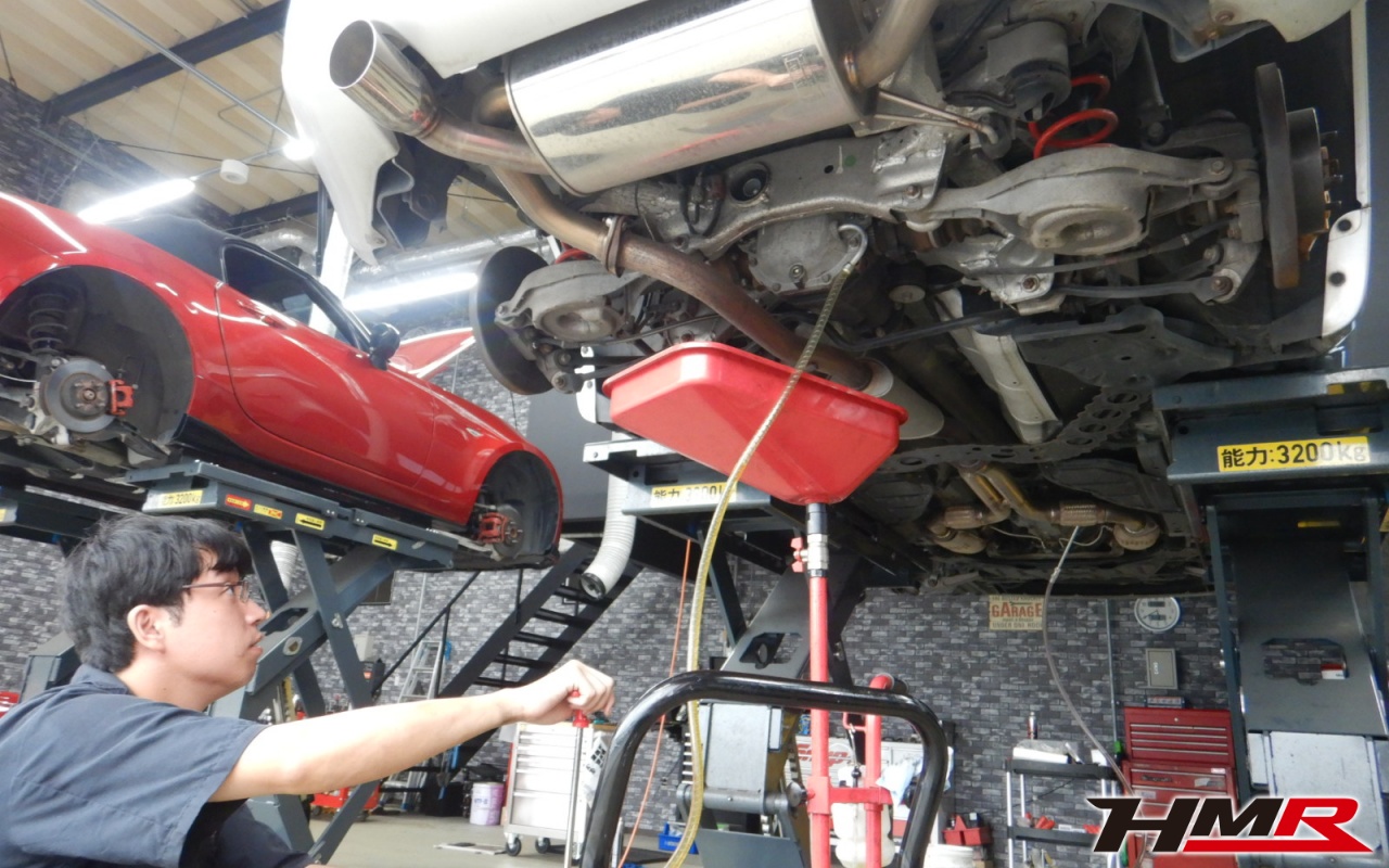HMR(エイチエムアール)の秋山です。今回はニスモS-tuneサス 社外マフラー装備のフェアレディZ(Z33)の納車前点検整備を行いました。担当メカニックは手代木です。