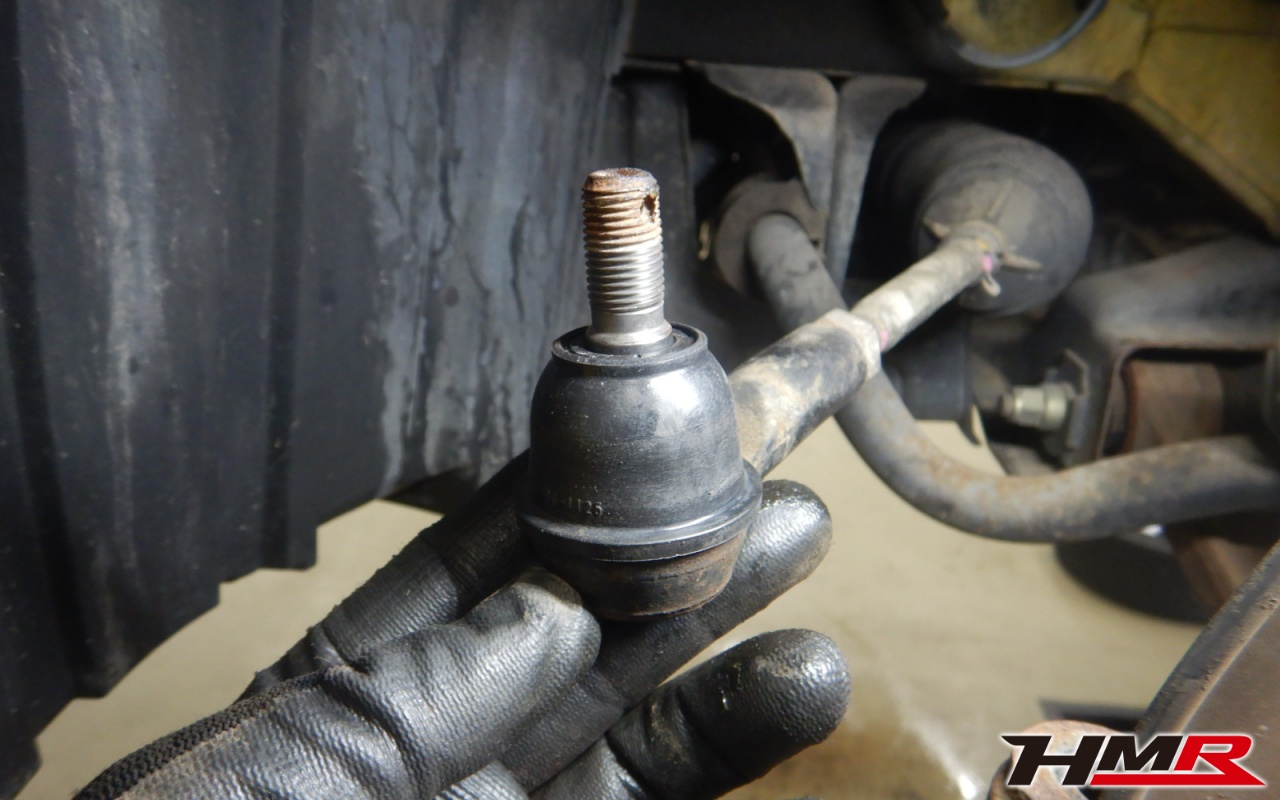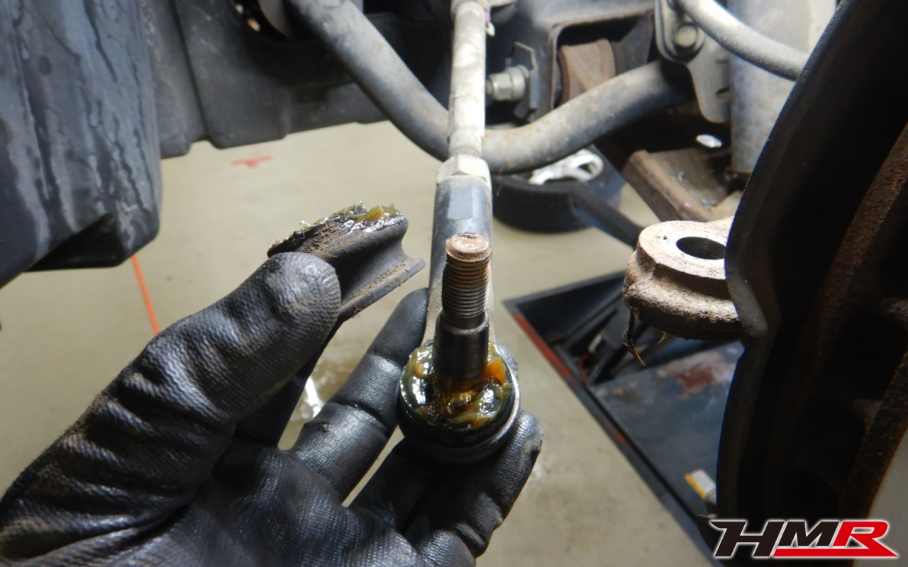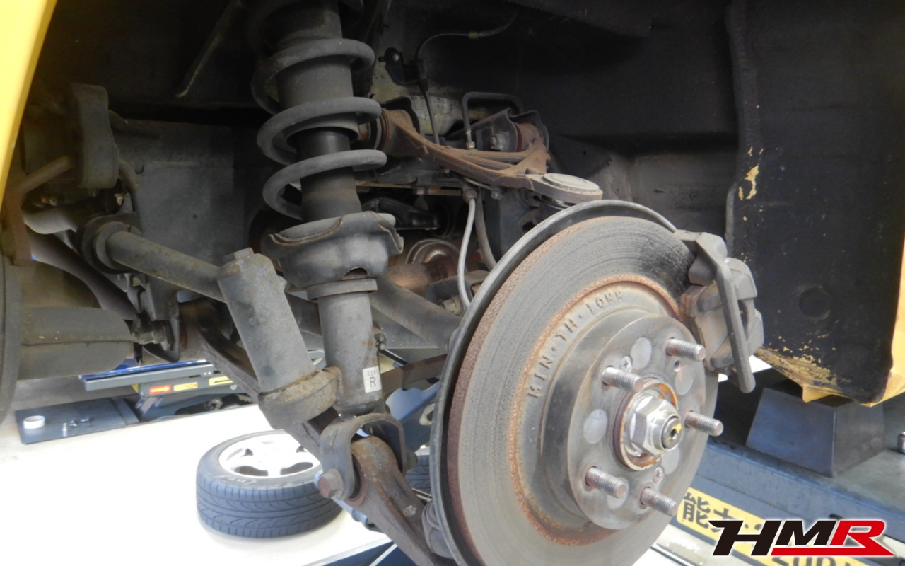 ハブベアリング・ボールジョイント、アーム・リンク類のガタ、ブッシュ・ブーツ類の劣化、エンジン・ミッション・デフからのオイル漏れと各マウント類、タイヤ溝の残量、空気圧の点検しました。左タイロッドエンドブーツ、右フロントスタビリンクロッドブーツが劣化していたため交換させていただきました。また左右トーコントロールロッドブーツにもヒビが見られましたがこちらはすぐの交換は必要ないのでタイミングを見ての交換をおすすめします。