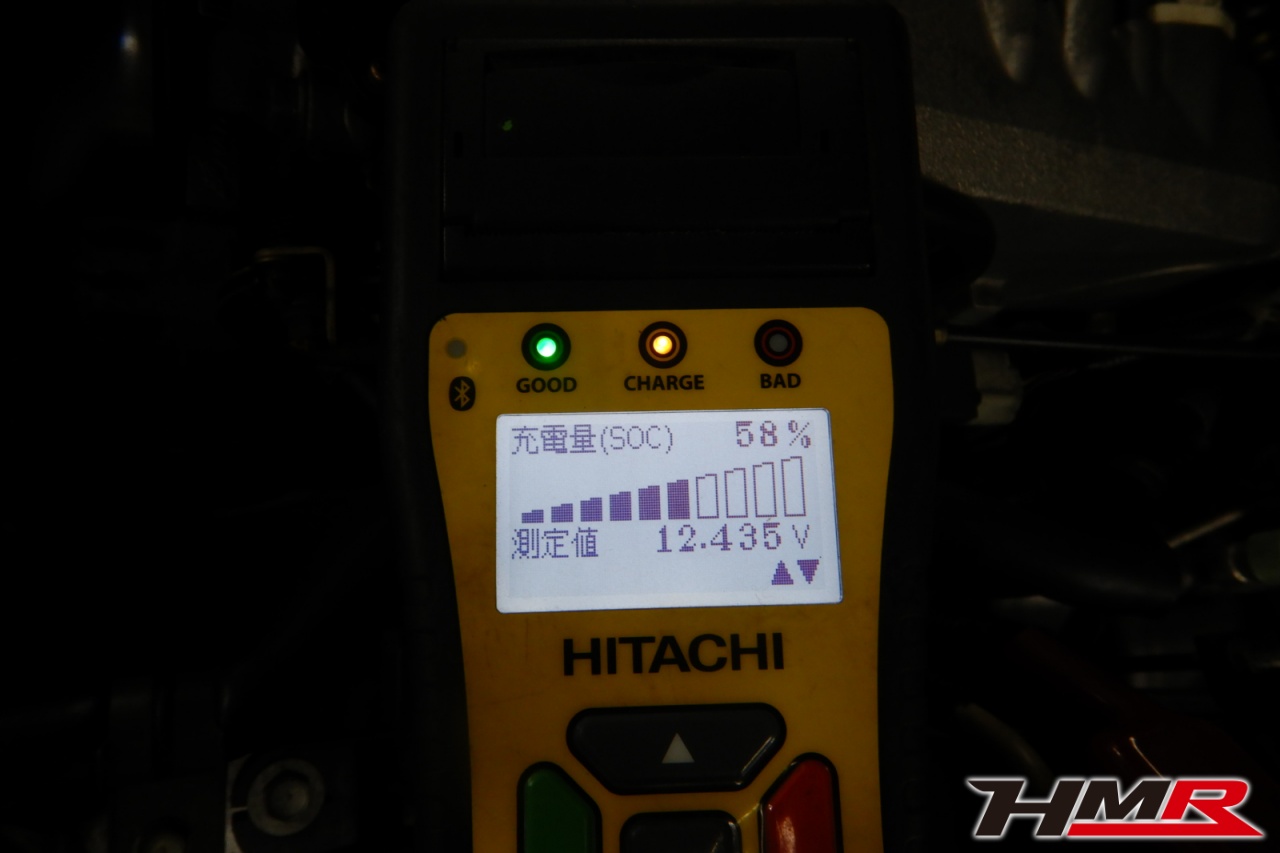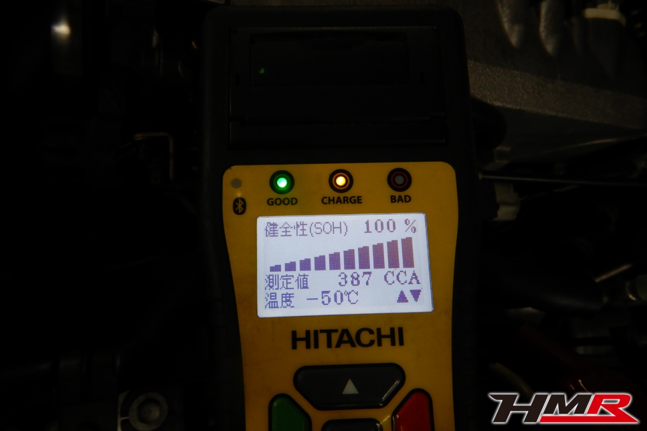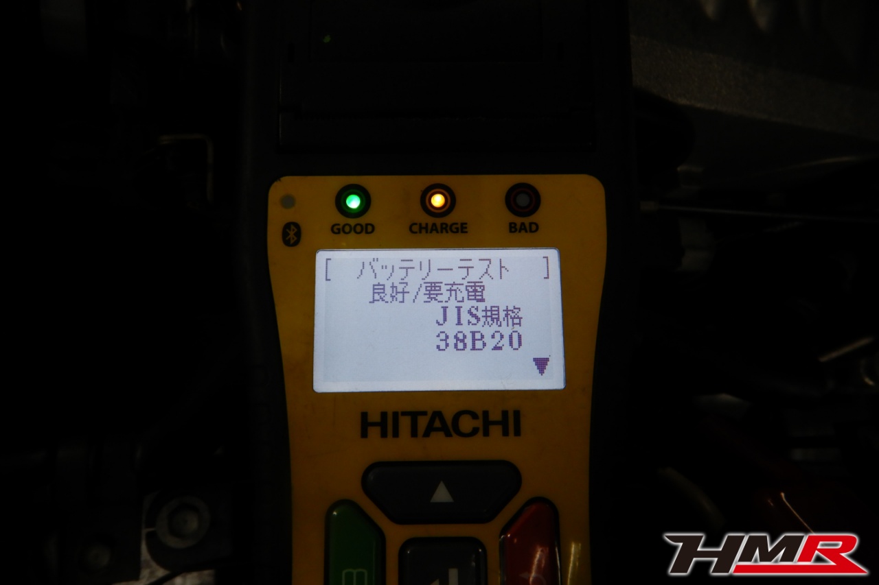 バッテリー、インテークホース、エアクリーナー、補機ベルト、プラグ、ブレーキ・クラッチマスターシリンダー、各部ゴム類の劣化、パッキン類・シール類からのオイル滲み・漏れ、ラジエターの劣化、冷却水漏れ、その他異音などをチェックしました。バッテリーが弱っていましたので後ほど充電させていただきました。