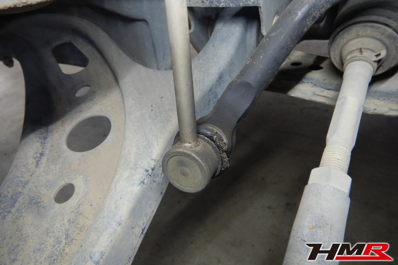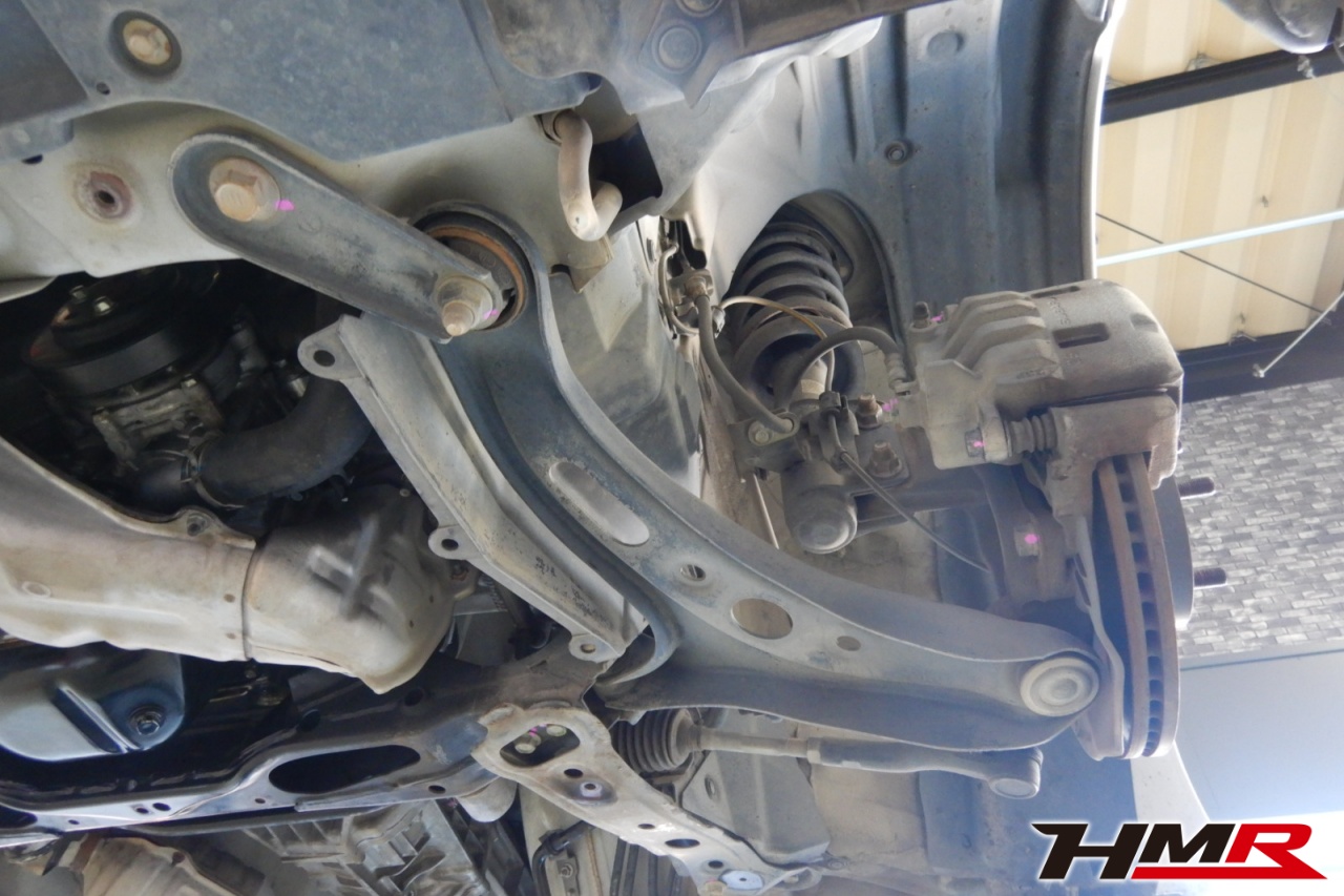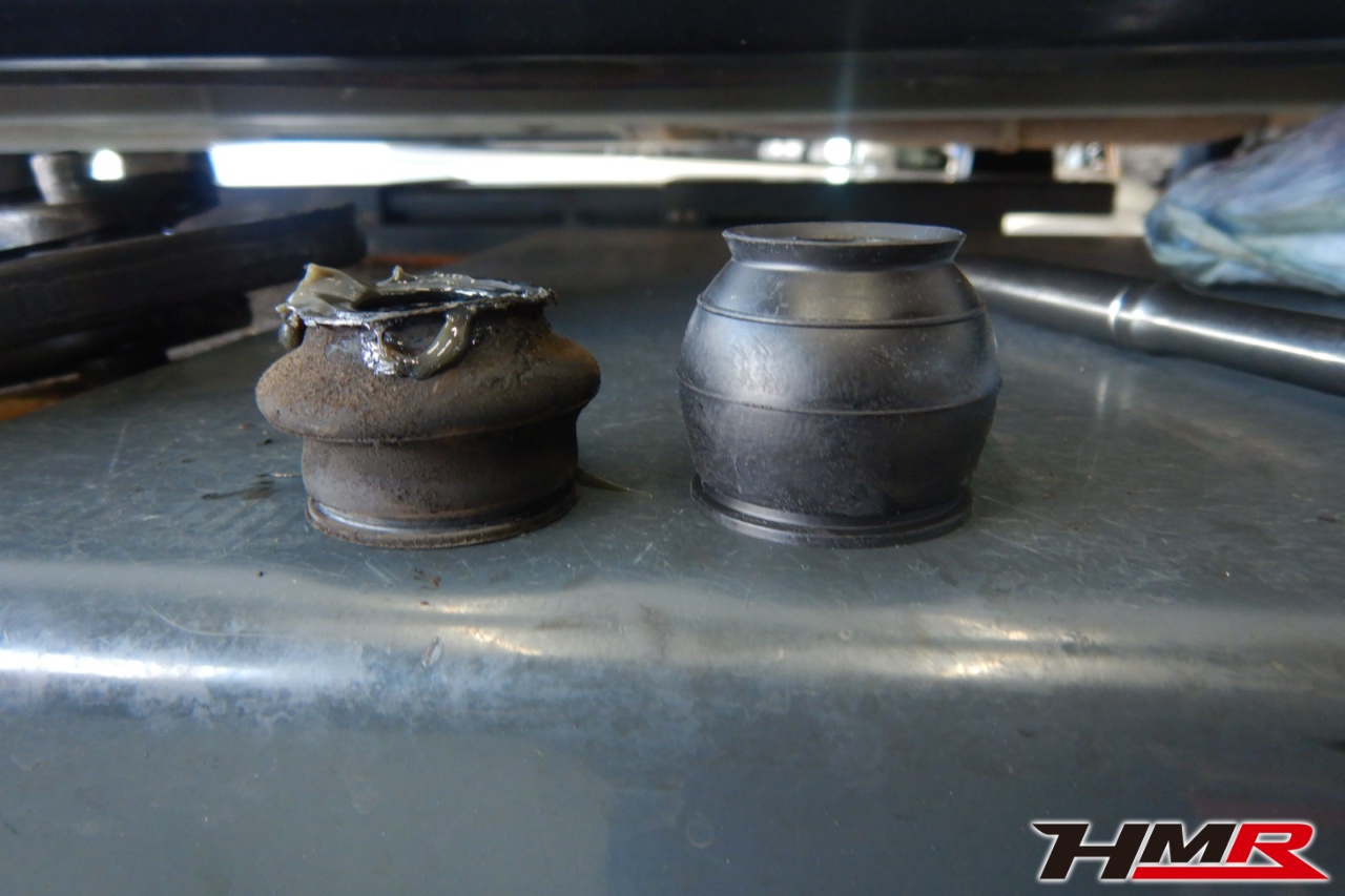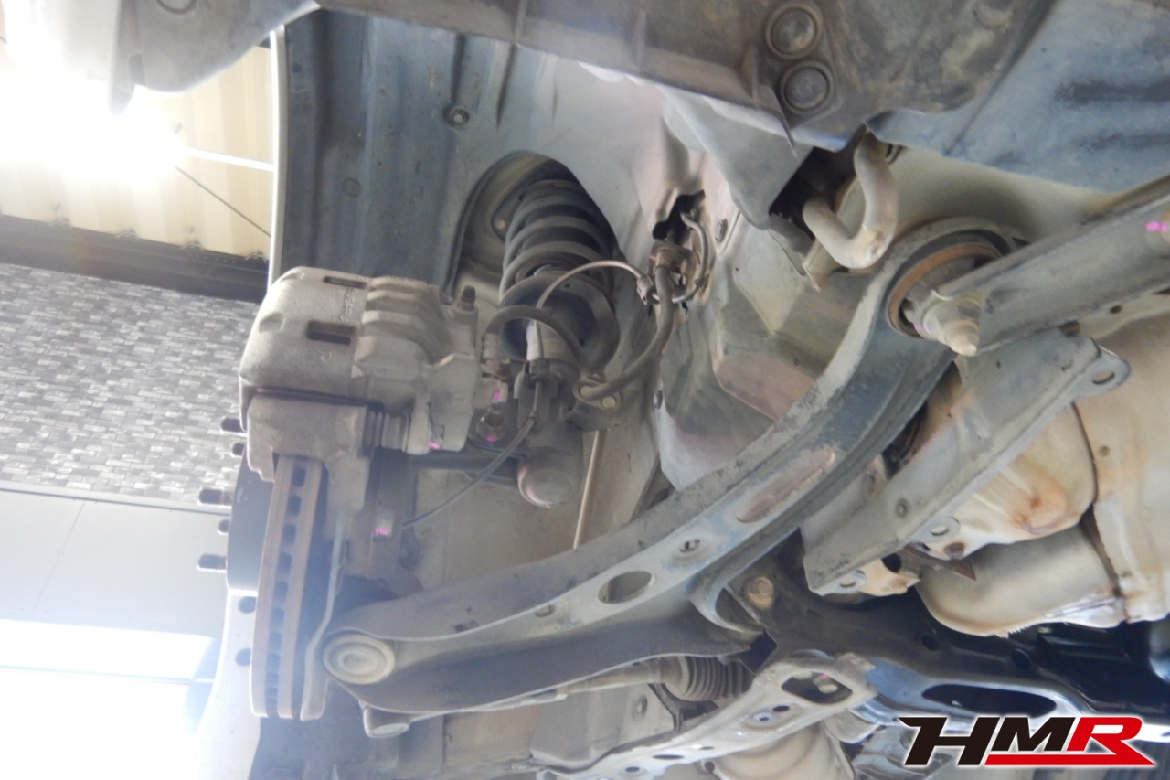 ハブベアリング・ボールジョイント、アーム・リンク類のガタ、ブッシュ・ブーツ類の劣化、エンジン・ミッション・デフからのオイル漏れと各マウント類、タイヤ溝の残量、空気圧の点検をしました。右側タイロッドエンドブーツ、左右フロントロアアームブーツ、左側フロントスタビリンクブーツが切れていましたので交換しました。またデフマウント、フロントロアアームブッシュにヒビが見られましたがすぐの交換は必要ないので今後タイミングをみて交換をおすすめします。