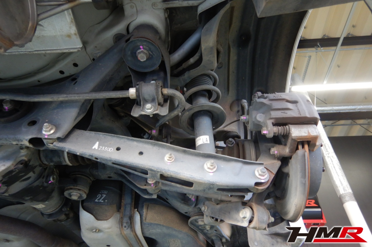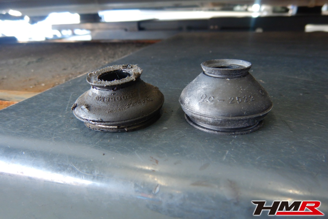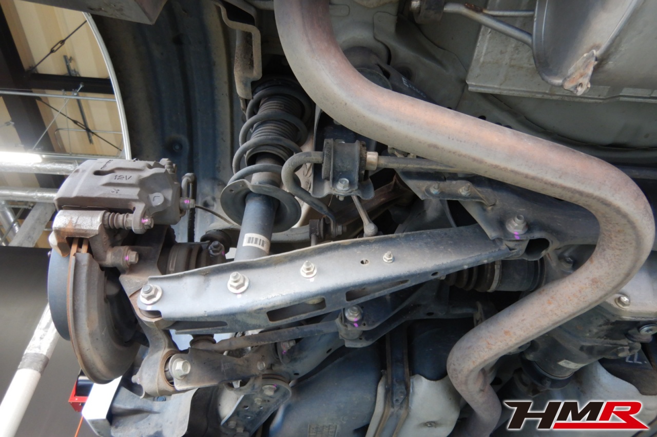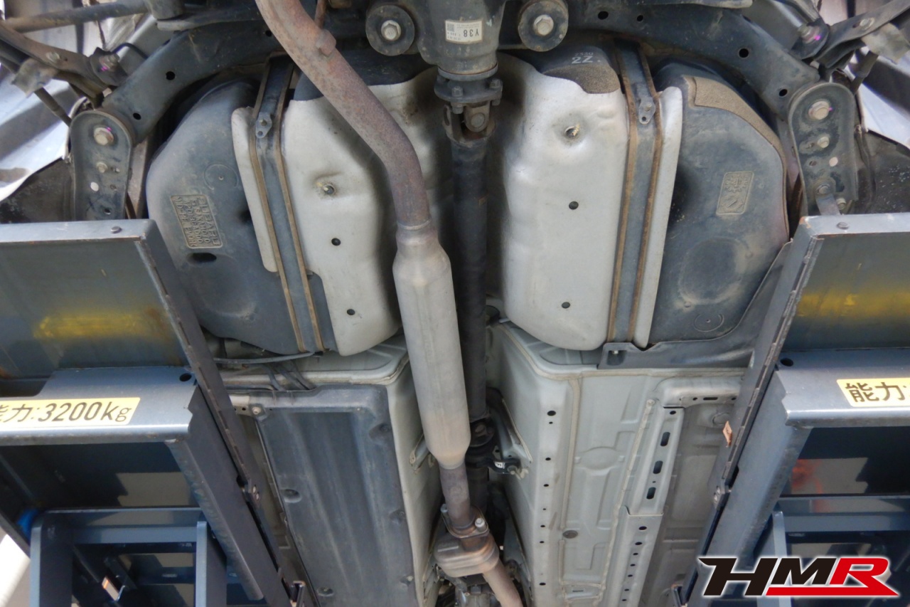 ハブベアリング・ボールジョイント、アーム・リンク類のガタ、ブッシュ・ブーツ類の劣化、エンジン・ミッション・デフからのオイル漏れと各マウント類、タイヤ溝の残量、空気圧の点検をしました。右側タイロッドエンドブーツ、左右フロントロアアームブーツ、左側フロントスタビリンクブーツが切れていましたので交換しました。またデフマウント、フロントロアアームブッシュにヒビが見られましたがすぐの交換は必要ないので今後タイミングをみて交換をおすすめします。