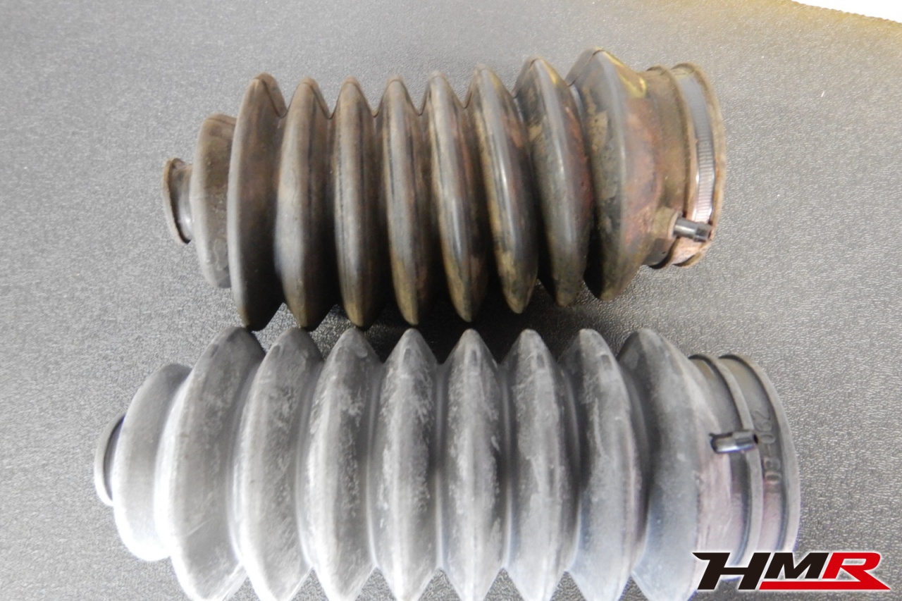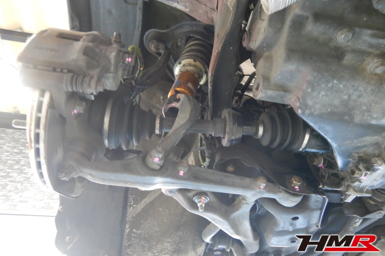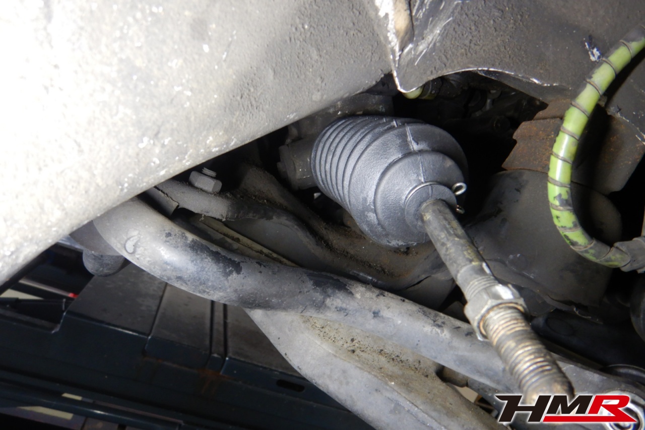 ハブベアリング・ボールジョイント、アーム・リンク類のガタ、ブッシュ・ブーツ類の劣化、エンジン・ミッション・デフからのオイル漏れと各マウント類、タイヤ溝の残量、空気圧の点検しました。タイロッドエンドブーツ、ラックブーツ、トレーリングアームブッシュにヒビが見られましたがすぐの交換は必要ないため今後乗っていく中での交換をおすすめします。右側ステアリングラックブーツは切れていたため交換しました。