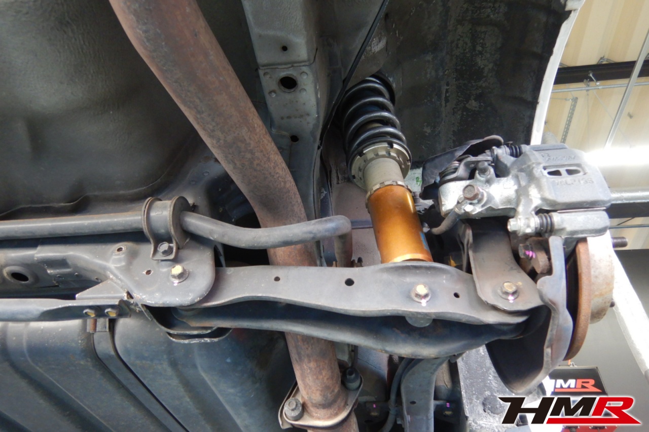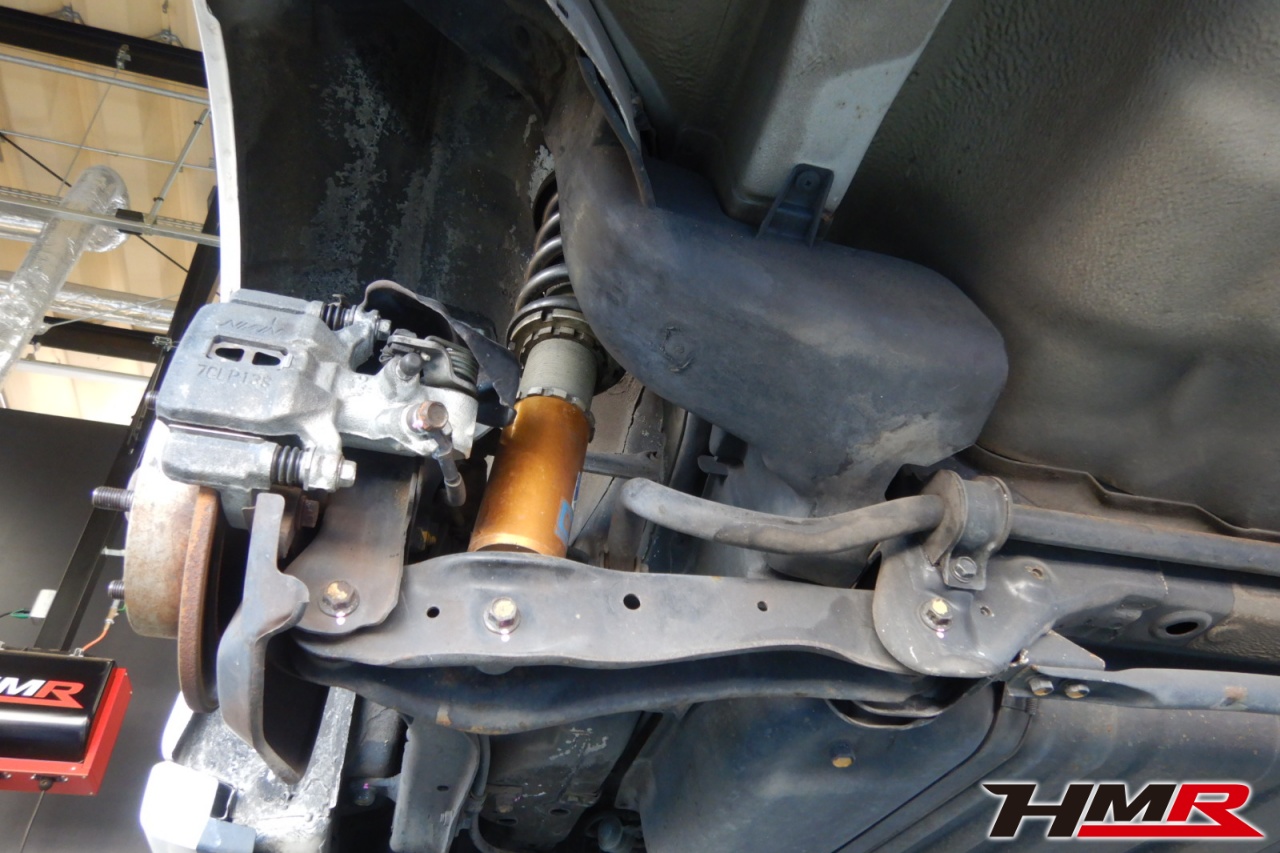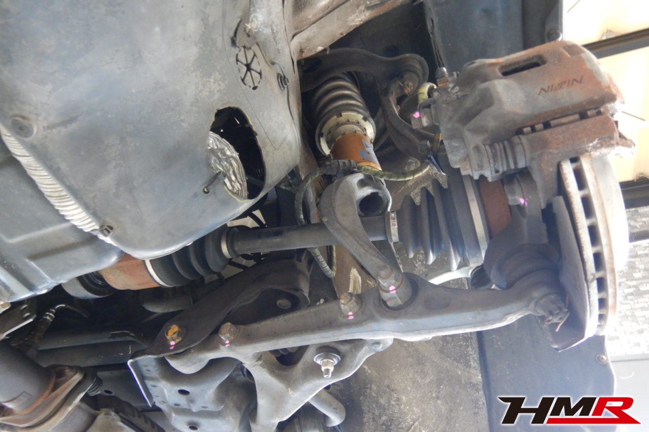 ハブベアリング・ボールジョイント、アーム・リンク類のガタ、ブッシュ・ブーツ類の劣化、エンジン・ミッション・デフからのオイル漏れと各マウント類、タイヤ溝の残量、空気圧の点検しました。タイロッドエンドブーツ、ラックブーツ、トレーリングアームブッシュにヒビが見られましたがすぐの交換は必要ないため今後乗っていく中での交換をおすすめします。右側ステアリングラックブーツは切れていたため交換しました。