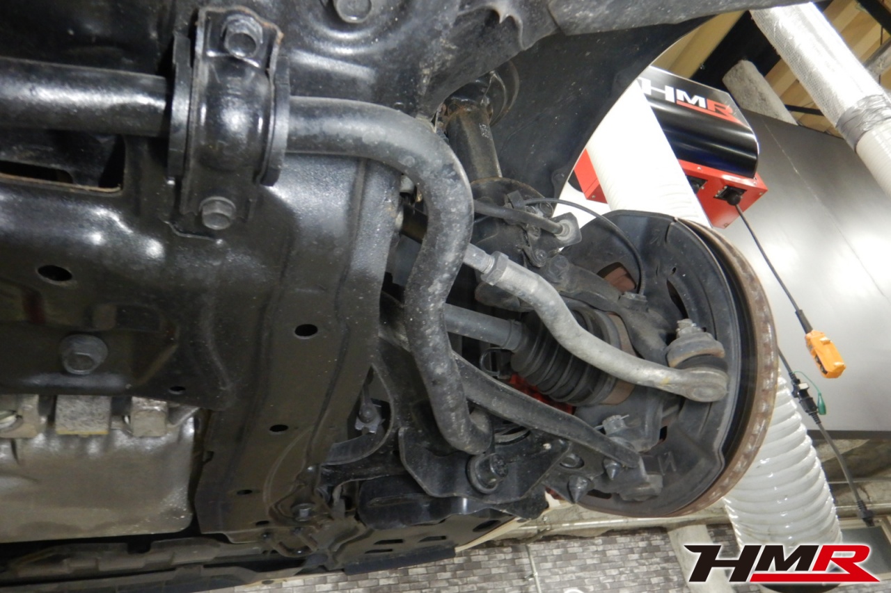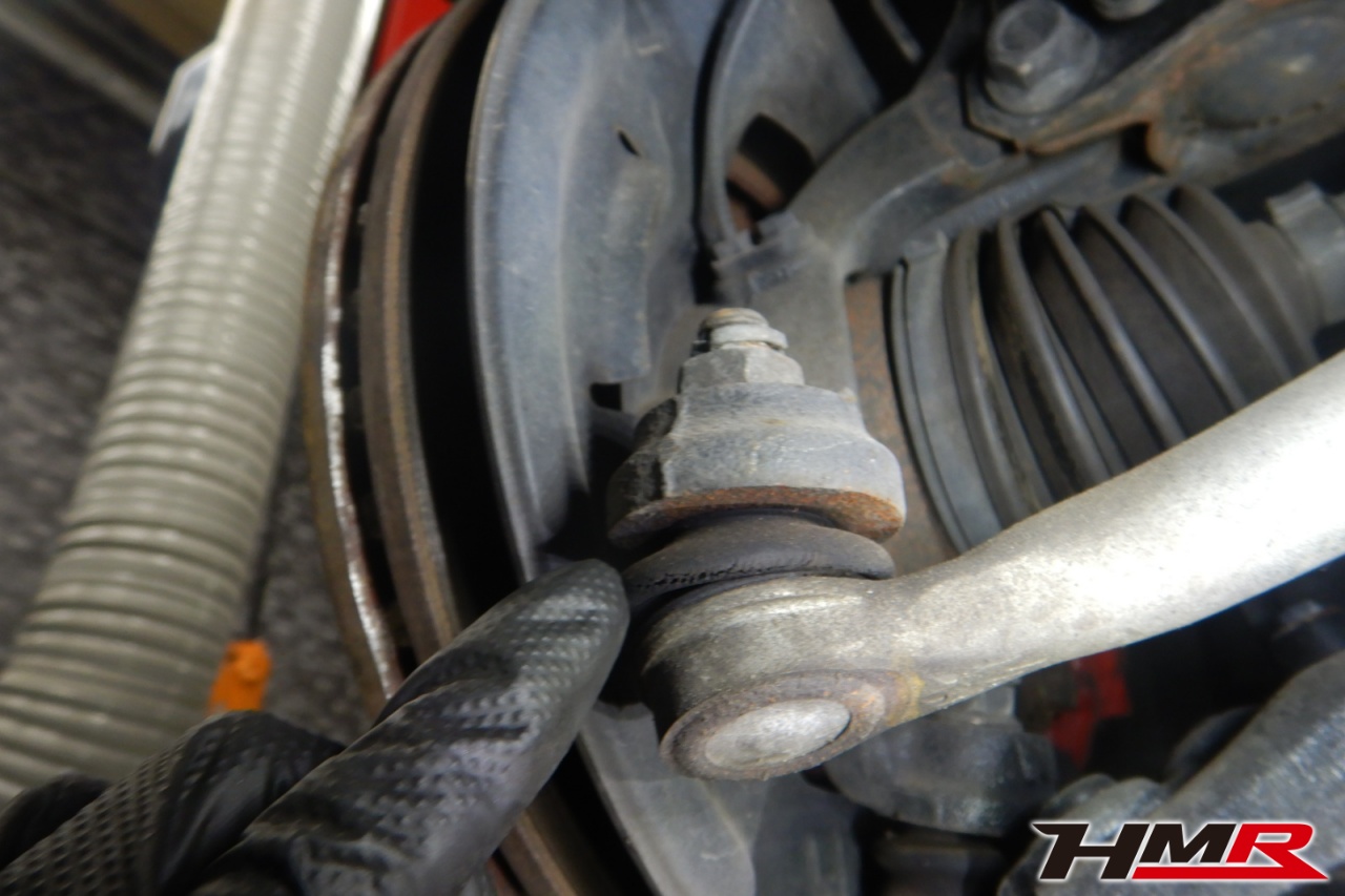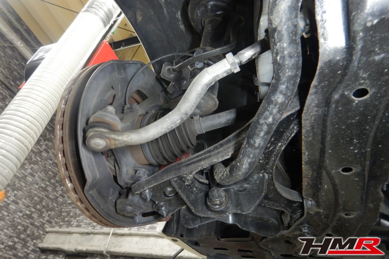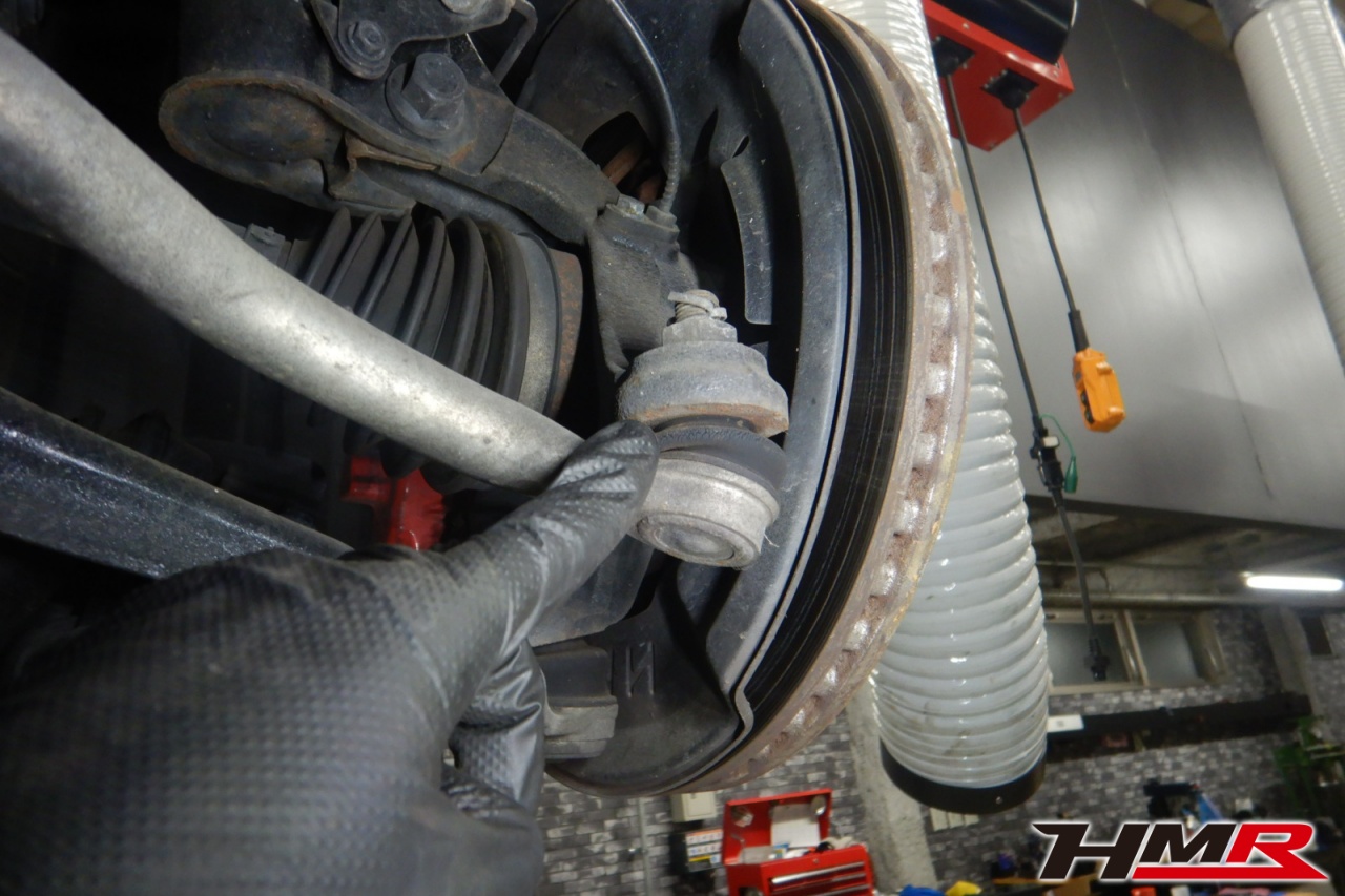 ハブベアリング・ボールジョイント、アーム・リンク類のガタ、ブッシュ・ブーツは類の劣化、エンジン・ミッション・デフからのオイル漏れと各マウント類、タイヤ溝の残量、空気圧の点検しました。左右タイロッドエンドブーツにヒビと、左右フロントロアアームブッシュにヒビが見られましたが、こちらも早急に交換する必要はないので乗っていく中でタイミングを見て交換をおすすめします。