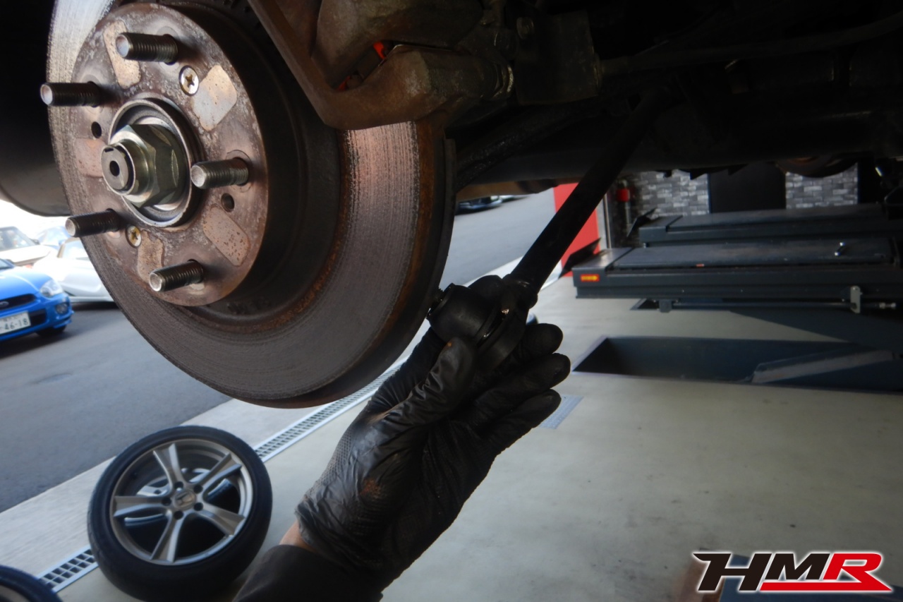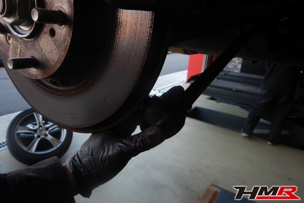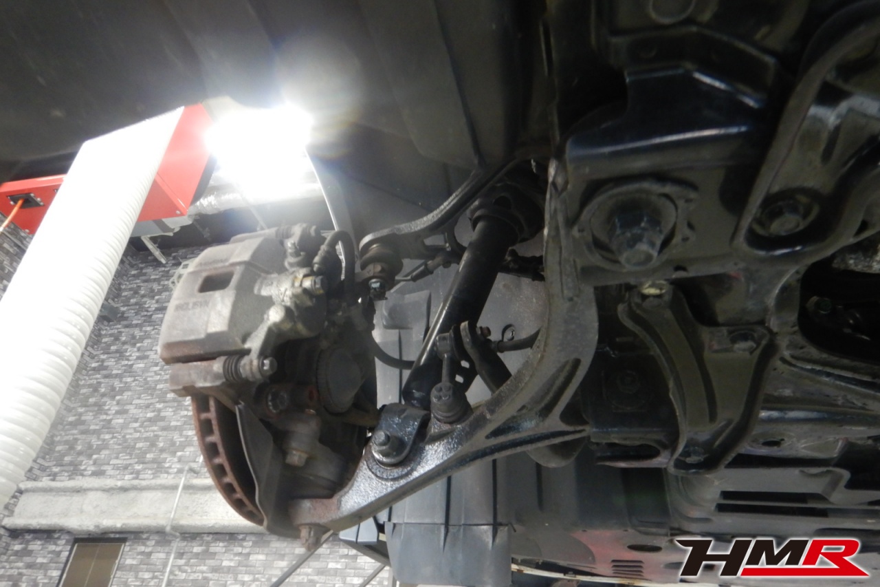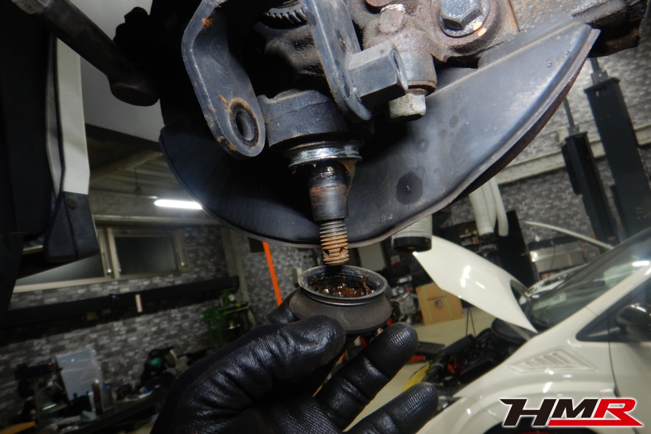 ハブベアリング・ボールジョイント、アーム・リンク類のガタ、ブッシュ・ブーツ類の劣化、エンジン・ミッション・デフからのオイル漏れと各マウント類、タイヤ溝の残量、空気圧の点検を行いました。左右タイロッドエンドブーツ、左右フロントロアアーム、左右フロントスタビリンク、左右トーロッドブーツにヒビが見られましたので交換しました。