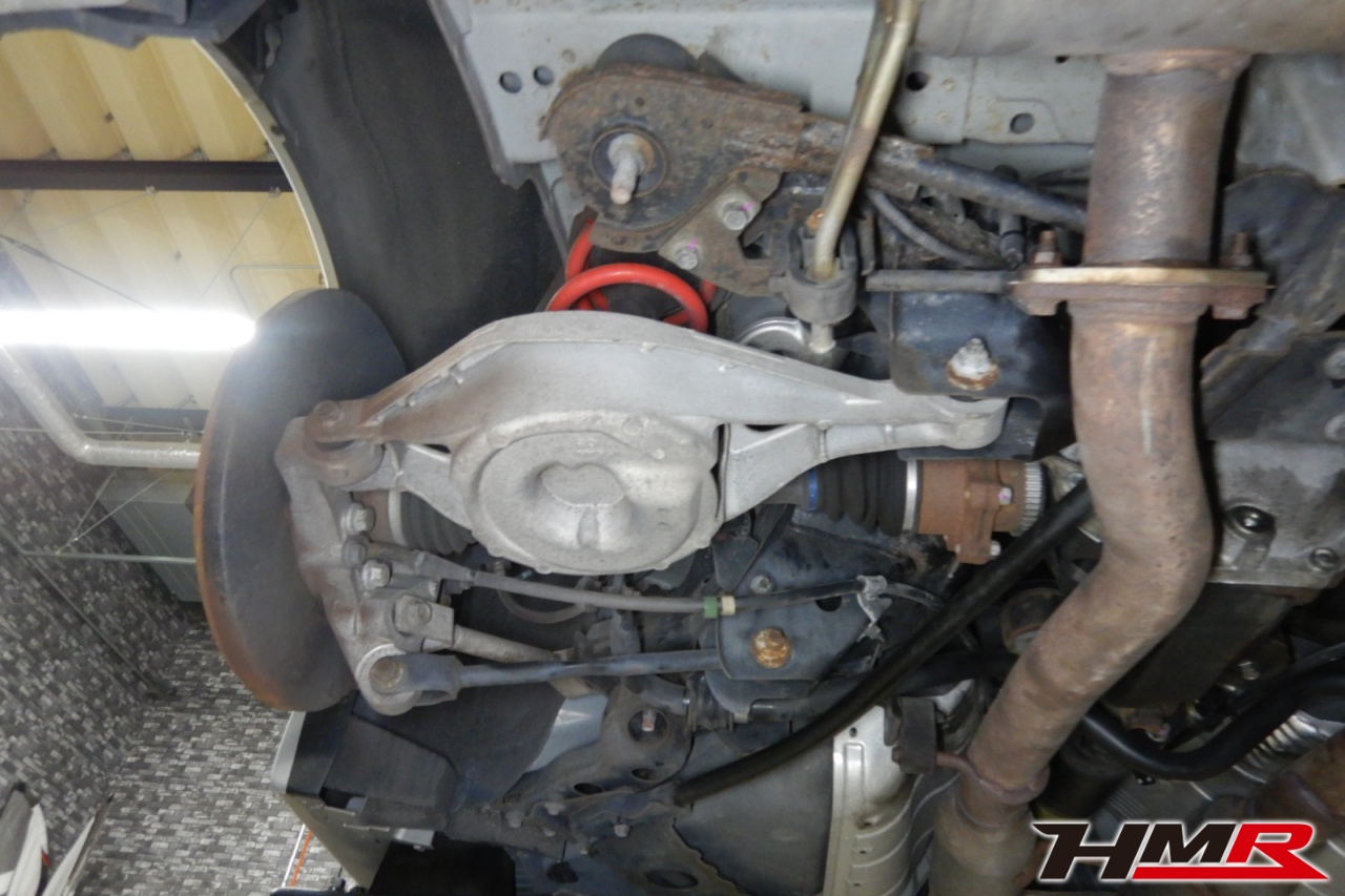 ハブベアリング・ボールジョイント、アーム・リンク類のガタ、ブッシュ・ブーツ類の劣化、エンジン・ミッション・デフからのオイル漏れと各マウント類、タイヤ溝の残量、空気圧の点検しました。デフマウントにヒビが見られましたのでデフサイドシールを交換しました。