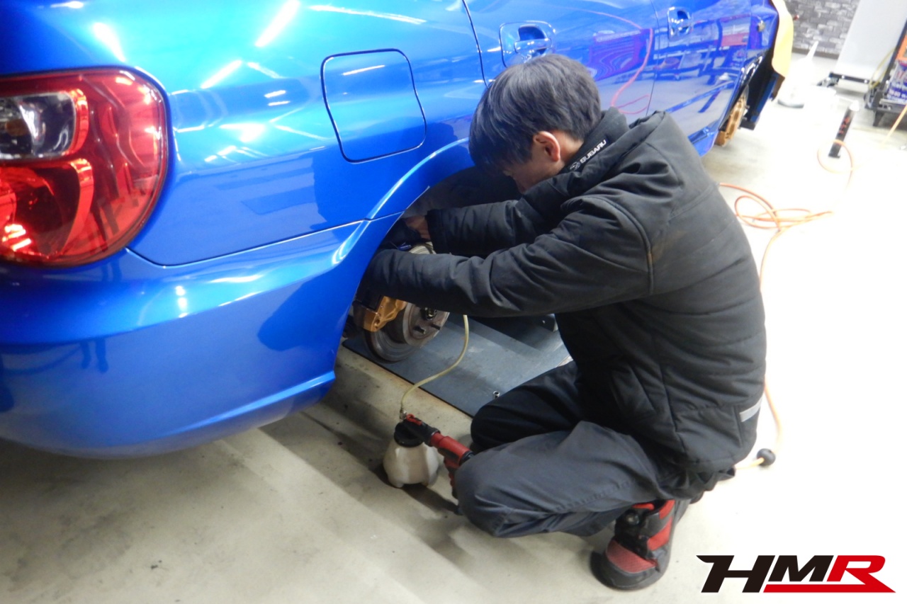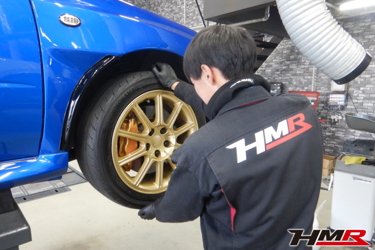 HMR(エイチエムアール)の秋山です。今回は純正17インチ TEIN車高調 ブレンボ装備のインプレッサWRX STI (GDB)の納車前点検整備を行いました。担当メカニックは手代木です。
