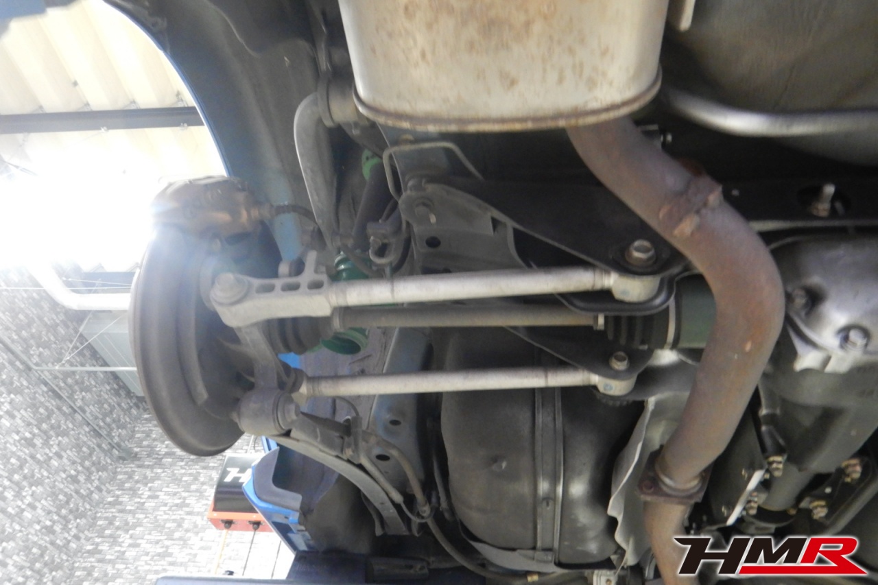 ハブベアリング・ボールジョイント、アーム・リンク類のガタ、ブッシュ・ブーツ類の劣化、エンジン・ミッション・デフからのオイル漏れと各マウント類、タイヤ溝の残量、空気圧の点検しました。特に問題ありませんでした。