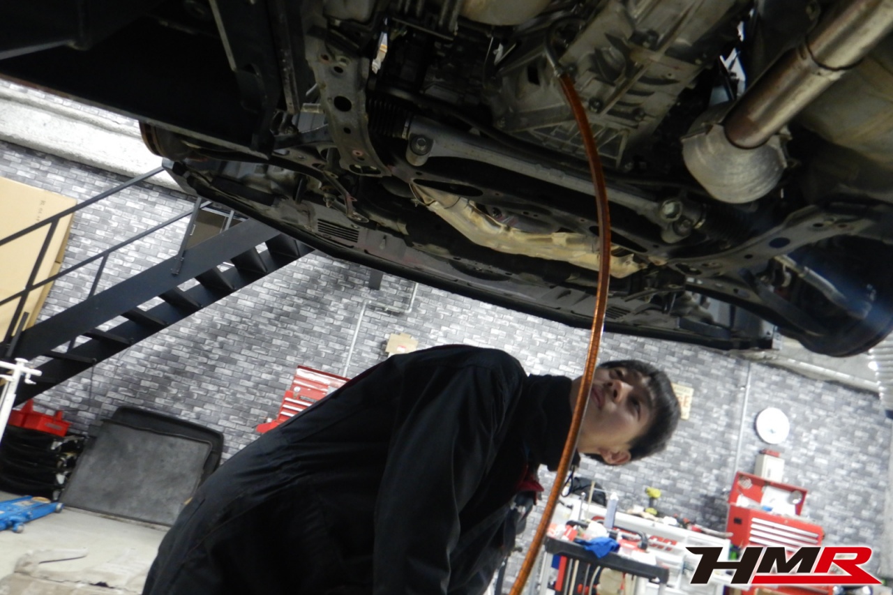 ハブベアリング・ボールジョイント、アーム・リンク類のガタ、ブッシュ・ブーツ類の劣化、エンジン・ミッション・デフからのオイル漏れと各マウント類、タイヤ溝の残量、空気圧の点検を行いました。