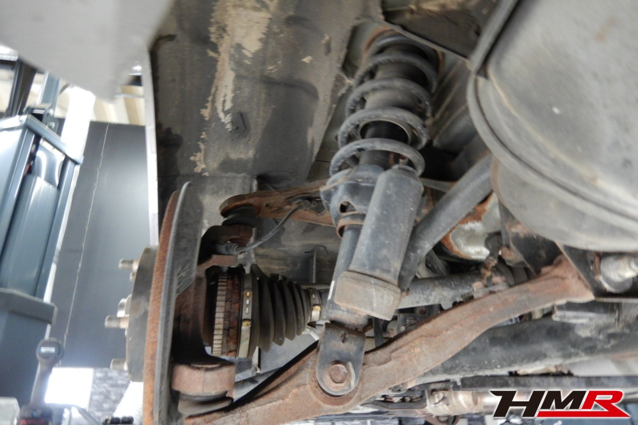 ハブベアリング・ボールジョイント、アーム・リンク類のガタ、ブッシュ・ブーツ類の劣化、エンジン・ミッション・デフからのオイル漏れと各マウント類、タイヤ溝の残量、空気圧の点検を行いました。フロント右側スタビリンクが劣化していたため交換しました。またフロントロアアームにヒビが見られましたがすぐに交換する必要はなかったため今後交換をおすすめします。